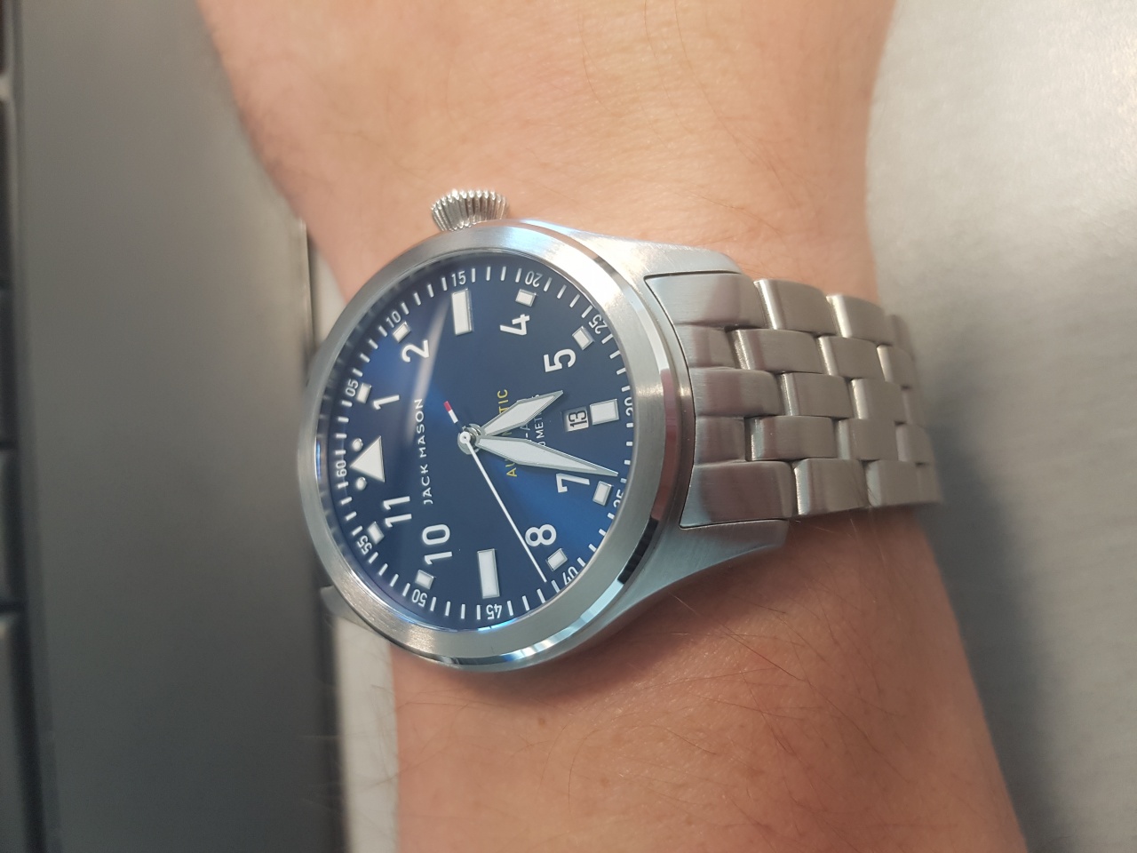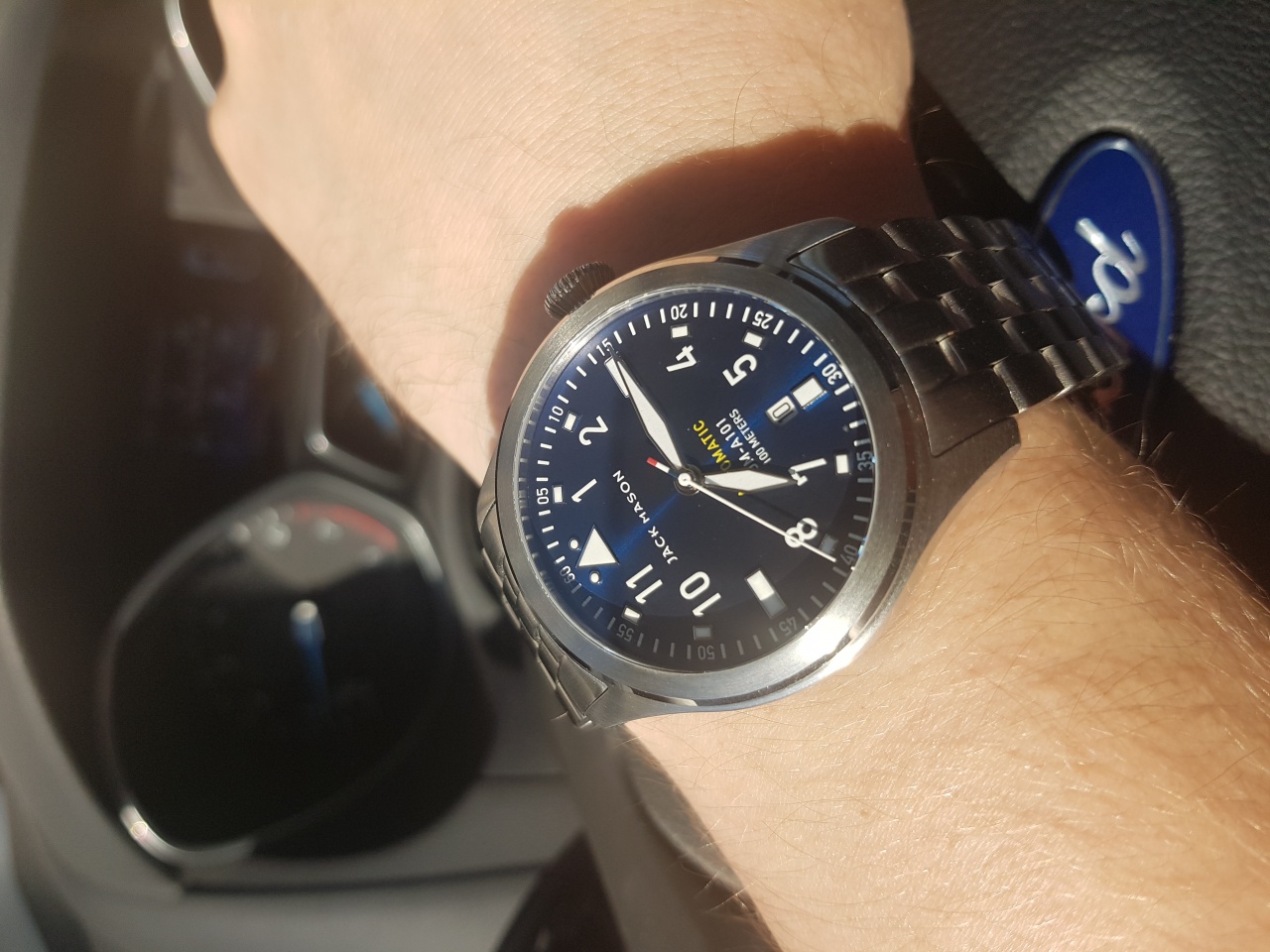 В очередной раз при поиске часов, мечтая найти недорогие Брайты и уже продав технологичные, но без "души" Citizen Perpetual наткнулся на Авито на интересное предложение - редкие, новые и недорогие пилоты от малоизвестного бренда "Jack Mason". Пусть и указано, что дизайн Техасский, но больно мне напоминает IWC Mark XVIII. Цена в розницу в районе $545, гарантия 10 лет (правда по чеку или копии, коих у продавца не было), японский механизм, сапфир, 100 м водозащита, качественное изготовление, приятный синий циферблат с отливом, органичное сочетание цвета и размера шрифтов - в принципе все, что мне нужно в часах.
