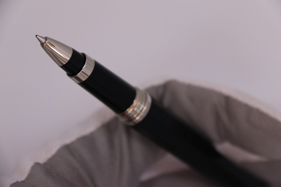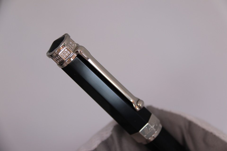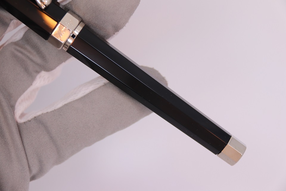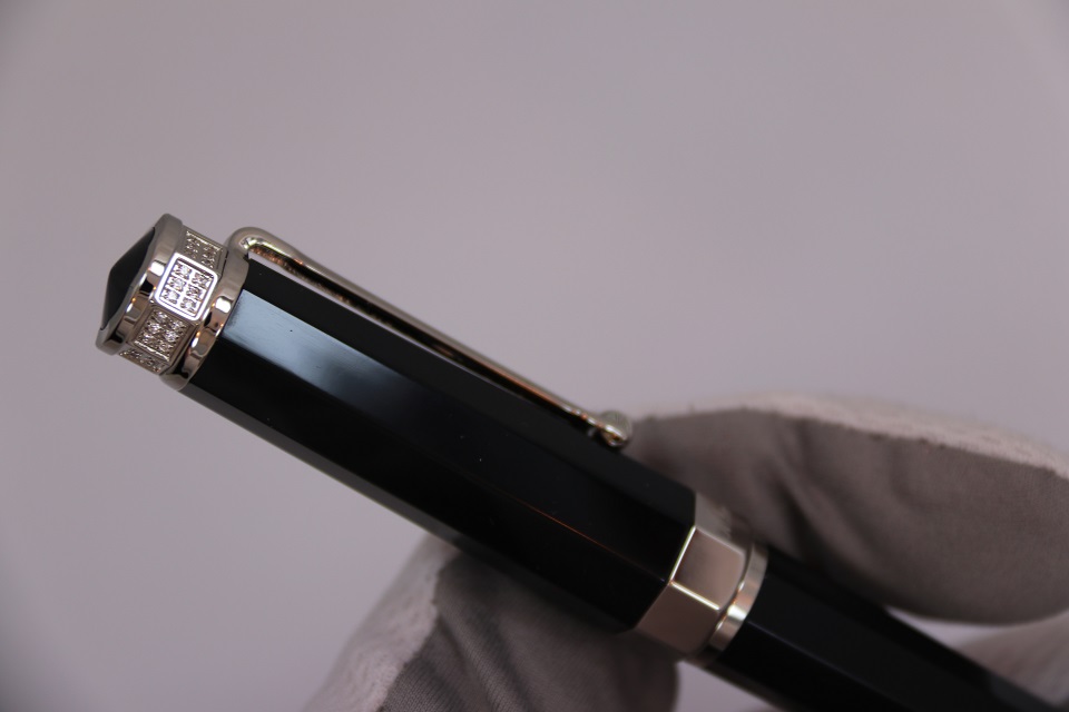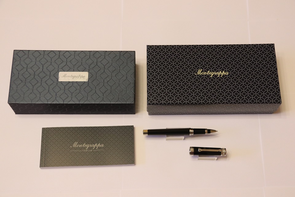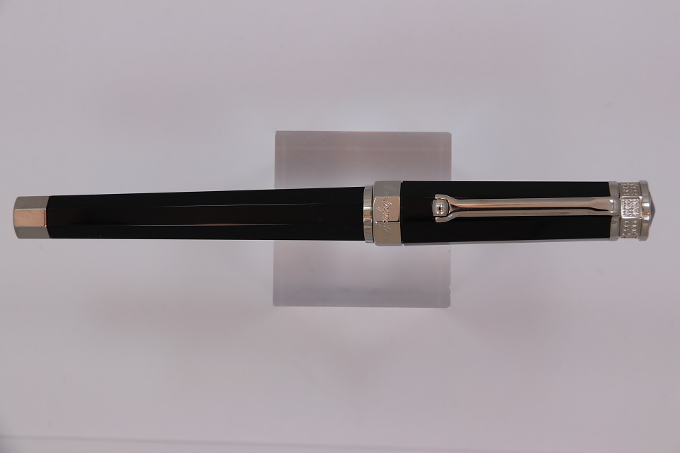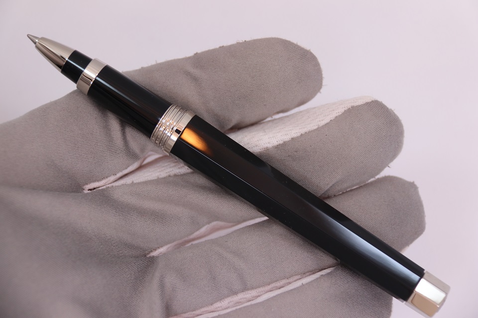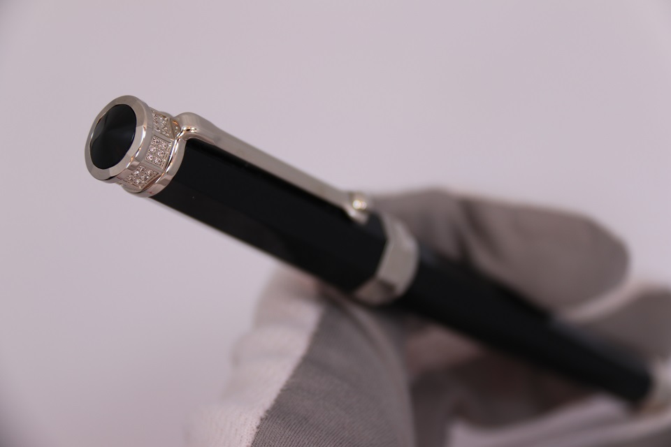Ручка-роллер Монтеграппа выполненна в неповторимом восьмигранном дизайне серии Nero Uno. Корпус пишущего инструмента сделан в строгом черном цвете из драгоценной смолы. Металлические делали покрыты палладием. Верхняя часть инструмента так же украшена ювелирными кристаллами Сваровски, выложенными по всей окружности колпачка. На ободе в нижней части колпачка выгравирован логотип компании Монтеграппа.