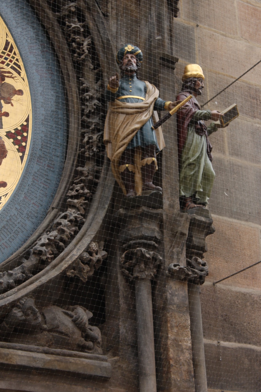 — В верхнем ряду, у циферблата, вместе со Смертью, стоят Тщеславие, Зависть и Жадность, а под ними — их антиподы: Скромность, Щедрость и Человечность, в одном ряду с архангелом Михаилом, — рассказывает он. — Причем предметы, которые они держат в руках, не имеют к данной расшифровке никакого отношения. Для барокко имели значение лишь четко выверенные жесты рук, а зеркало, кошелек, музыкальный инструмент и подзорная труба появились у фигур совсем недавно. Их вручил им в 1948 году Войтех Сухарда. Как художник-кукольник, он по-своему «приблизил скульптуры к народу». По-моему, зря, так как в оригинале речь шла о пороках и достоинствах, основе человеческой морали. К примеру, из Щедрости он сделал Звездочета, а из Человечности — вообще Писаря, по сути, Чиновника, с учетом близости ратуши.