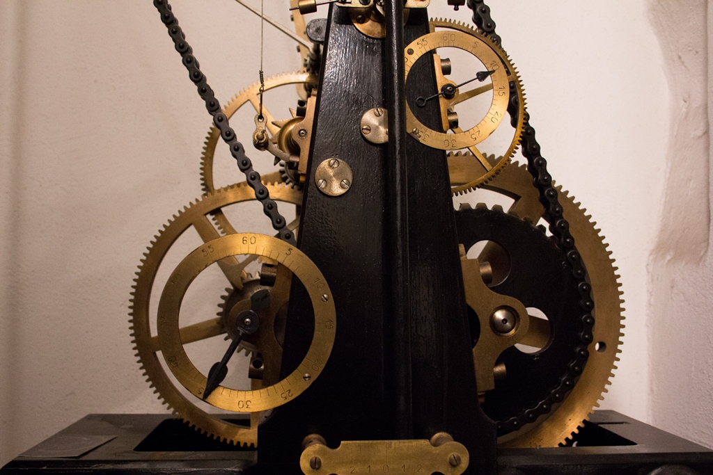 Конечно, некоторые части старинного механизма пришлось заменить. Например, стертые подшипники, которые изначально были квадратными. К тому же теперь массивные гири-отвесы перетягивает электрический мотор, хотя раньше это делалось вручную. Да и шестисоткилограммовый старинный механизм Орлоя теперь стоит на бетонной подставке, так как деревянная сгорела в 1945 году.