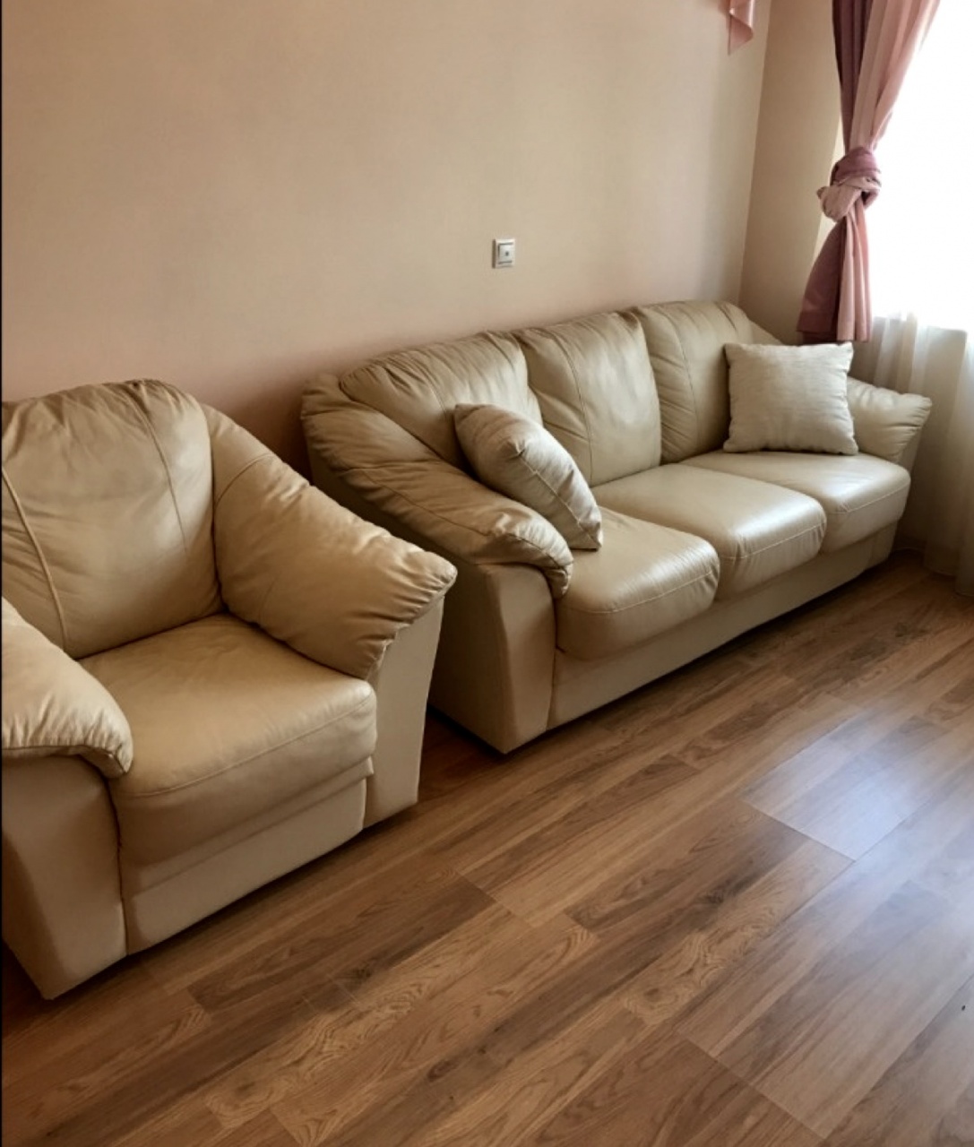 В гостиной комнате: раскладной кожаный диван, кресло, стенка.