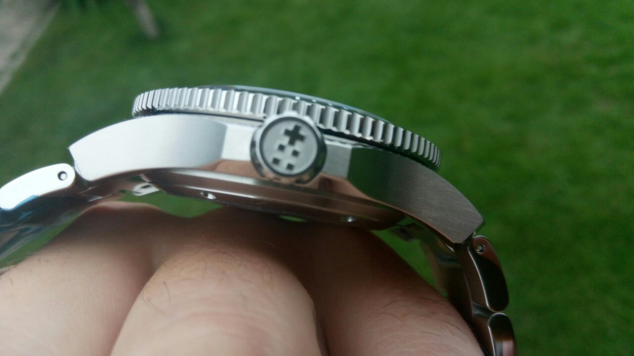 Swiss made. Корпус из нержавеющей стали, керамический безель, толстенное сапфировое стекло 3,4 мм. с антибликовым покрытием и водозащита 600 (!) метров. Завинчивающаяся заводная головка. Потрясающий браслет (сатин + полировка), застежка с кнопками раскрытия и системой быстрого удлинения на 3 положения. Потрясающая глубокая гравировка на задней крышке. Что еще нужно?