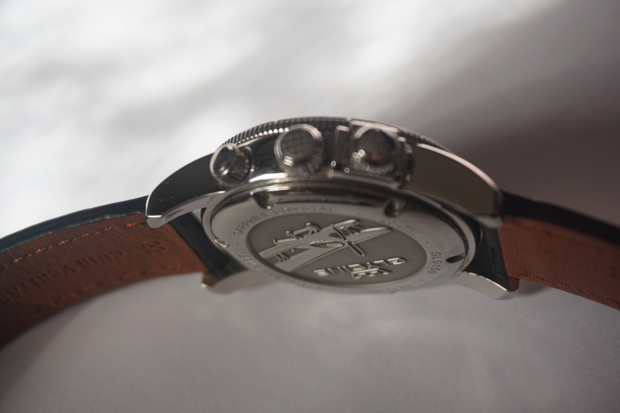 Безель серебристый, вращающийся, с разметкой второго часового пояса и фирменным фиксатором на резьбе.
