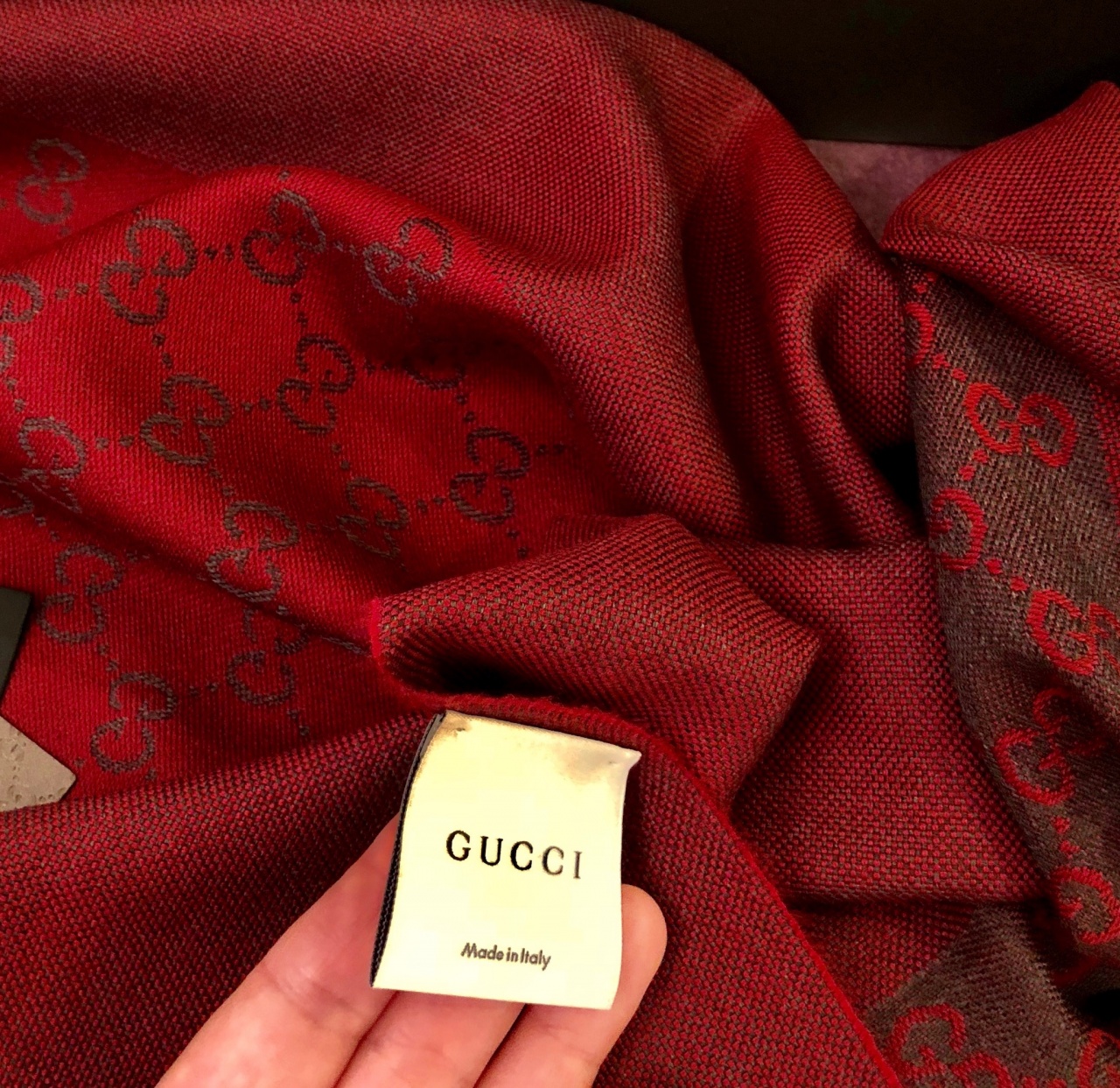 Роскошные цвета - терракотовый в сочетании с темно-серо-синим рисунком Signature GG методом интарсии (двустороннее наложение рисунков). Размер оптимальный - 40 на 180 см, мягкая и теплая мериносовая шерсть 100%. Тонкая 2см бахрома на концах. Все бирки и ярлыки на изделии. Фирменный пакет пакет.