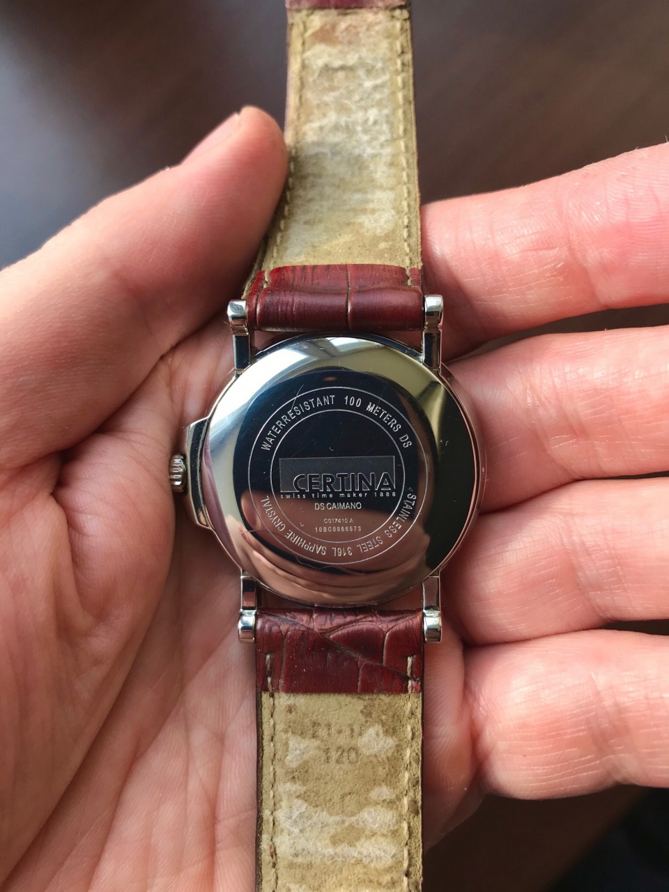 Продам Certina ds caimano. Костюмник на некрупное запястье. Диаметр 38 мм. Толщина 8,6мм. Посадочный по ушкам 21 мм. Батарейка менялась в начале года. На корпусе незначительные царапки. Сапфир в идеале. Секундная стрелка попадает в метки. Функция EOL. Калибр ЕТА F06.111. Ремешок стоковый,немного уставший. Без коробки. В наличие только мануальная книжечка.