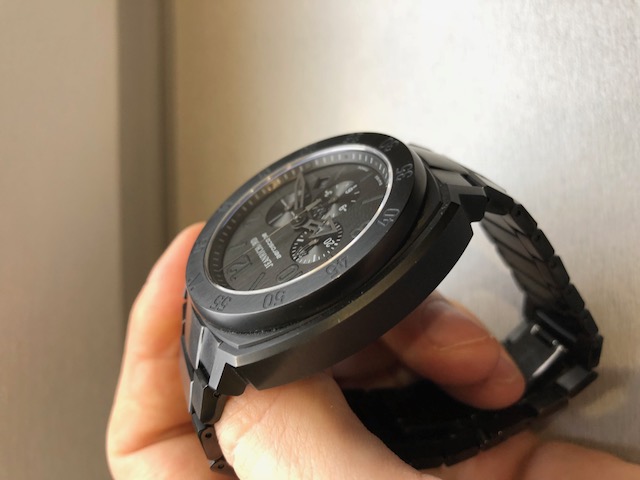 Прочный корпус из титана диаметром 44 мм имеет черное DLC покрытие. Корпус характерной формы напоминающий подушку сочетается с круглым безелем на котором выгравированы цифры минутной шкалы. Большинство поверхностей корпуса и лицевая часть безеля сатинированные. Благодаря удлиненным кнопкам хронографа с карбоновыми вставками и крупной заводной головке часы очень удобны в обращении. Водонепроницаемость корпуса достигает 100 метров.