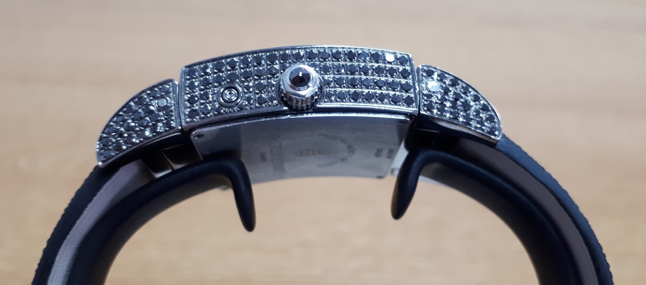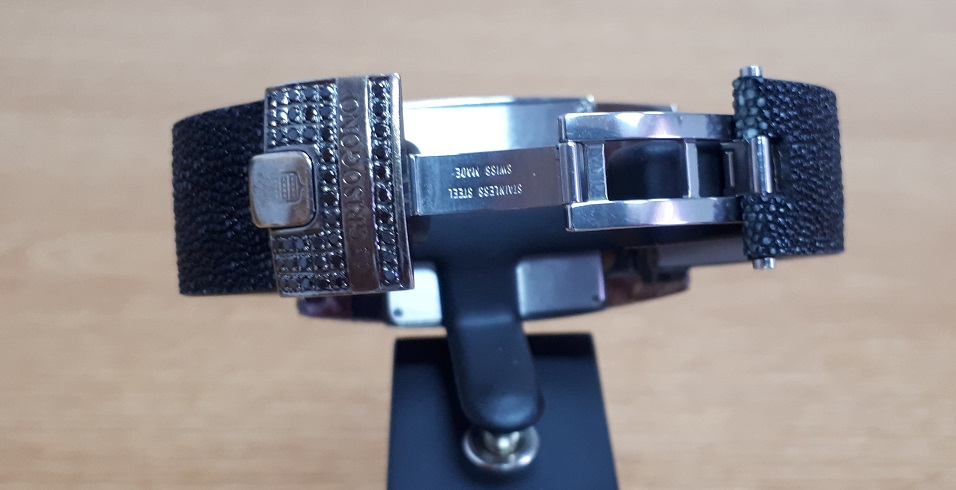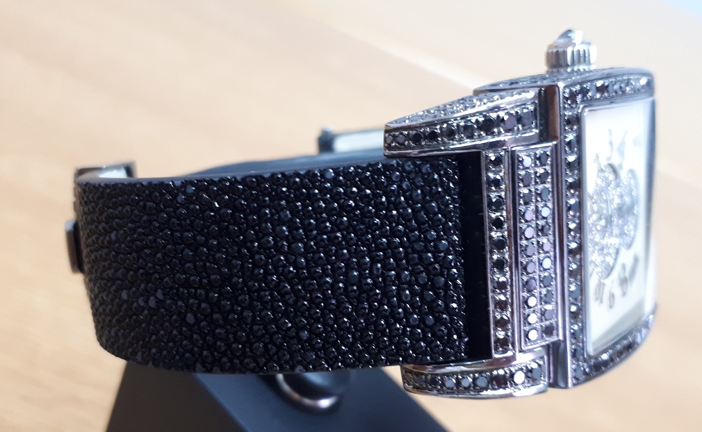 Часы и застежка дополнительно инкрустированы черными синтетическими и белыми натуральными бриллиантами.