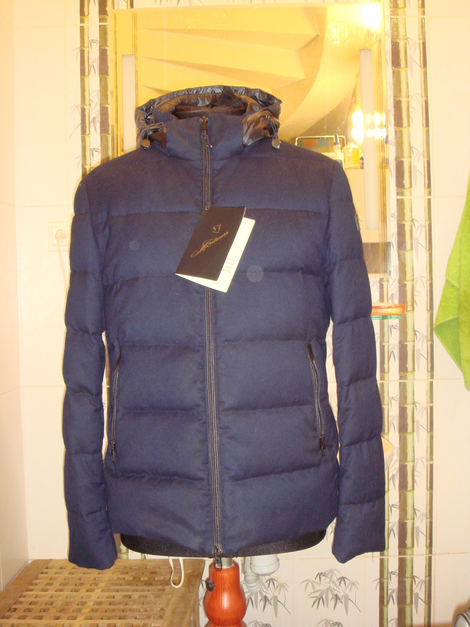 Продается новый шерстяной мужской пуховик итальянского бренда MONTECORE превосходного исполнения, джерси, простеган снаружи и изнутри, синего цвета, логотип, высокий воротник, полноценный капюшон из полиамида с утяжкой, снаружи непромокаемый, двухходовая молния с логотипом бренда, боковые прорезные карманы на молнии , внутренние карманы на молнии, внутри на пуху гуся, карманы, молния отделаны кожей, состав: 100% Lana Vergine, Vitale Barberis Canonico - Super 120s, все бирки прилагаются , гарантированный 100 % оригинал, размер 52(IT), производство Италия. .
