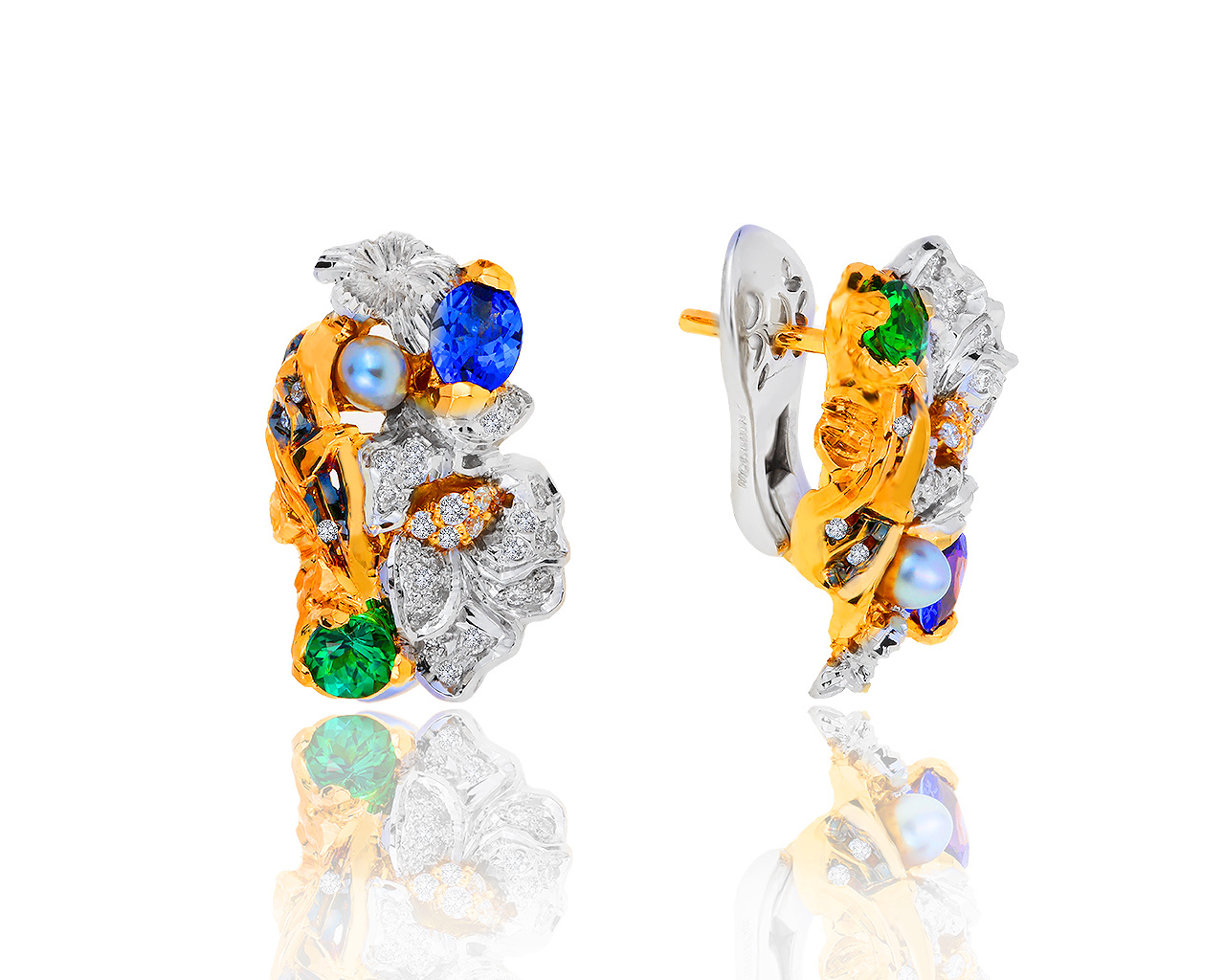 Представляем вашему вниманию нарядные золотые серьги с жемчугом 3 мм, танзанитами 0.50ct, турмалинами 0.40ct и бриллиантами 0.30ct от всемирно известного бренда Moiseikin из коллекции Almond Blossom.