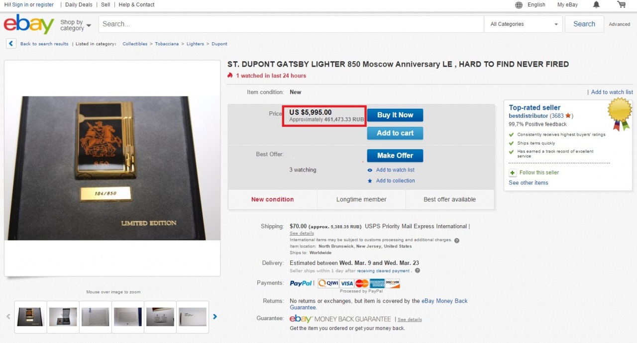 Зажигалка имеет серийный номер 205/850 (Цена на интернет ресурсах США и Канады составляла от $4795 (серийный номер 204/850) до $5995(серийный номер 104/850). На российском Авито зажигалка под номером 014/850 продавалась за 700 000 руб.