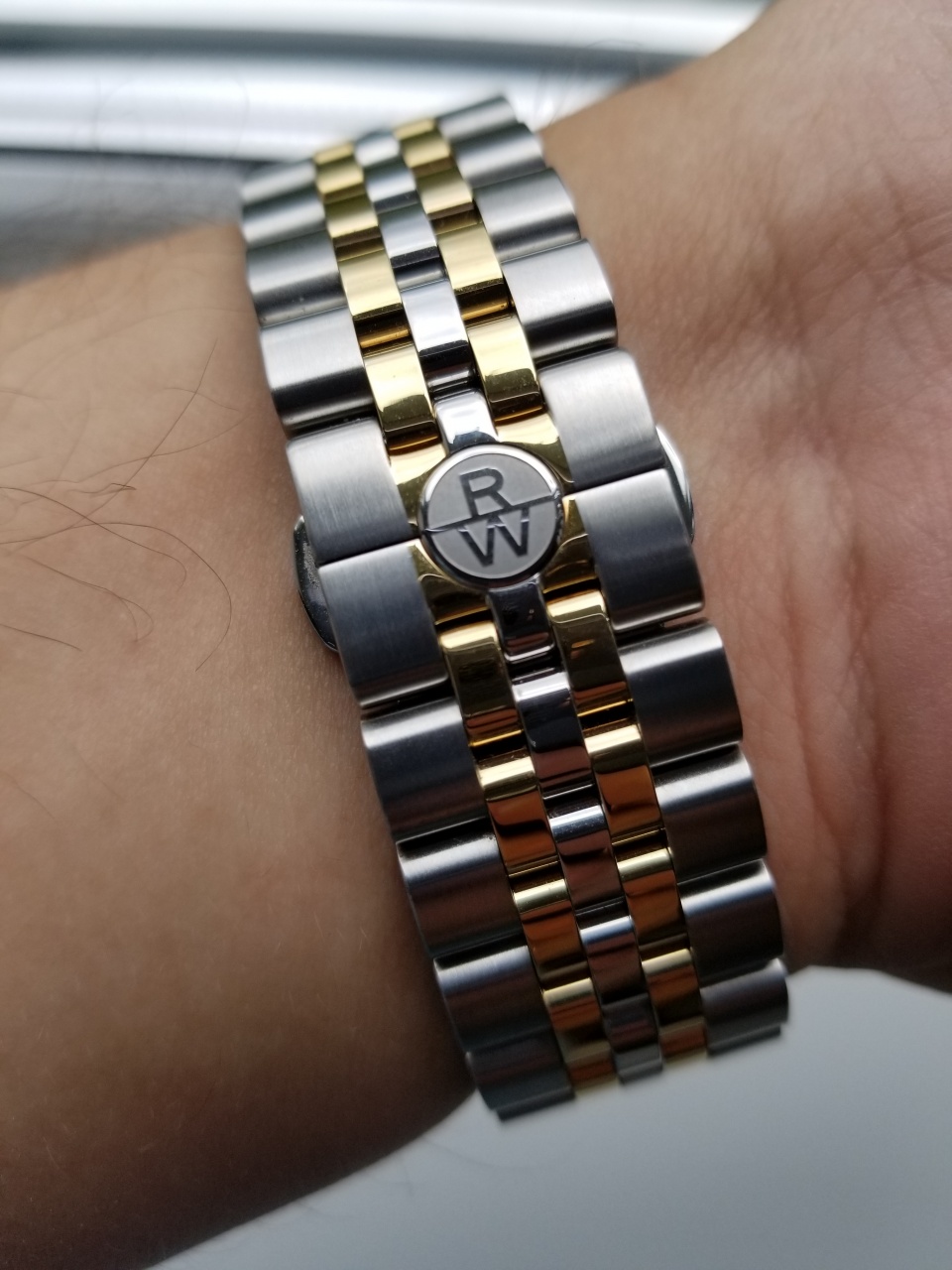 Фирменные атрибуты RW на заводной головке и браслете придают часам шарма, а золотое исполнение браслета и корпуса делают свое дело - часы выглядят очень стильно и дорого.