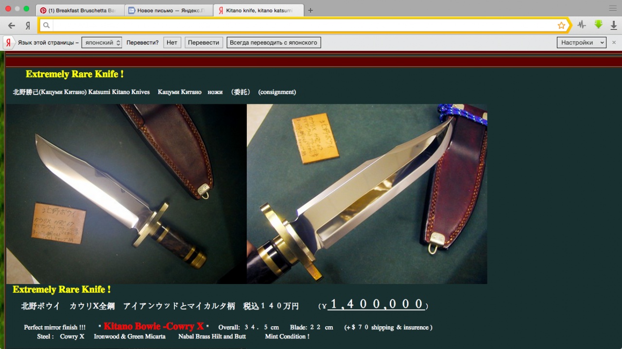 предлагается к обмену вот такой нож самого известного и самого дорогого мастера ножедела из Японии KATSUMI KITANO, который делал ножи из самой дорогой и редчайшей стали в мире COWRY X и ZDP 189. Изделия этого мастера распродаются ещё на стадии заготовки. Что бы вы понимали ценник начинается от 5 тыс долл на ножи с длиной лезвия 8-10 см, а на более длинные модели цена стартует от 10 тыс долл. Представленный нож, приобретён в Японии на аукционе. Там вся подробная инфа. Цена в РФ. тоже есть на другом фото. Но, так как данный экземпляр продать довольно сложно, то предлагается к обмену на часы ролики, дайтону, ГМТ, Суб, как в стали, так и биколорный, новые, либо условное бу. Нож принадлежит моему знакомому, коллекционеру. Он попросил меня разместить нож на данном ресурсе. Инфу и ценник о мастере и его изделиях можно найти в инете,...