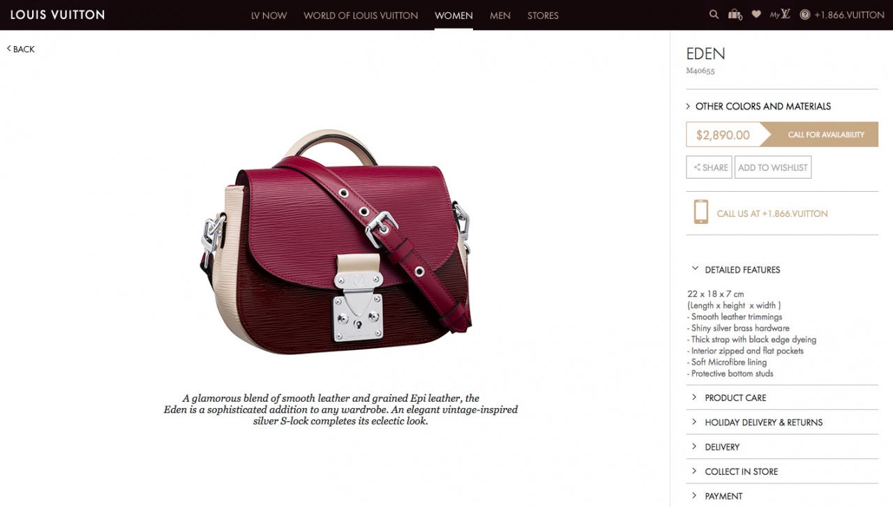 "В гламурном сочетании гладкой кожи и кожи Epi сумка Eden это изысканное дополнение к любому гардеробу. Роскошная и красочная модель обратит на себя внимание, идеально подойдет для любого случая и украсит любой наряд. Знаменитые символы Дома Louis Vuitton - замок S-lock в стиле замков винтажных дорожных сундуков, а также изящная ручка в стиле сумок Steamer завершают неповторимый и элегантный образ."