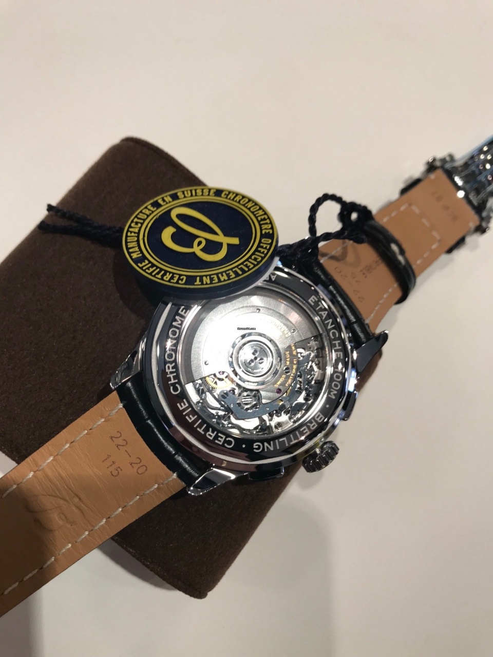 Хронограф. Калибр Breitling 01. Запас хода до 70 часов. Циферблат серебристый. Задняя крышка частично прозрачная.