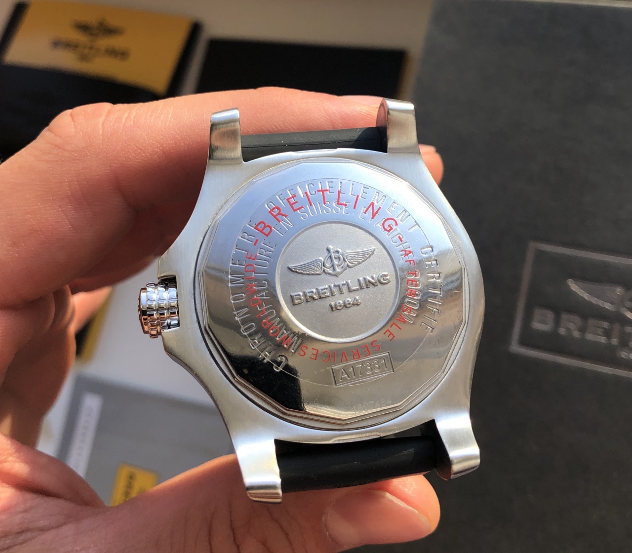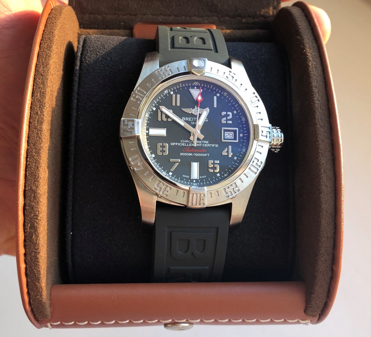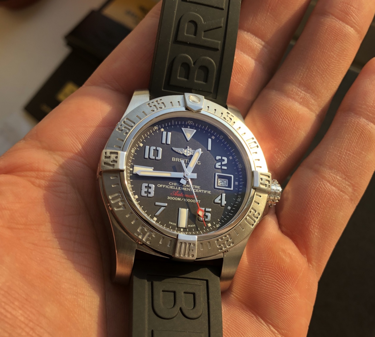 Очень массивные, крупные и увесистые часы для солидных и уверенных в себе парней. Отличный яркий люм, шикарный внешний вид, лоск и узнаваемый шильд Breitling.