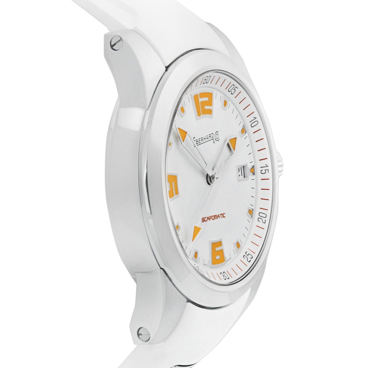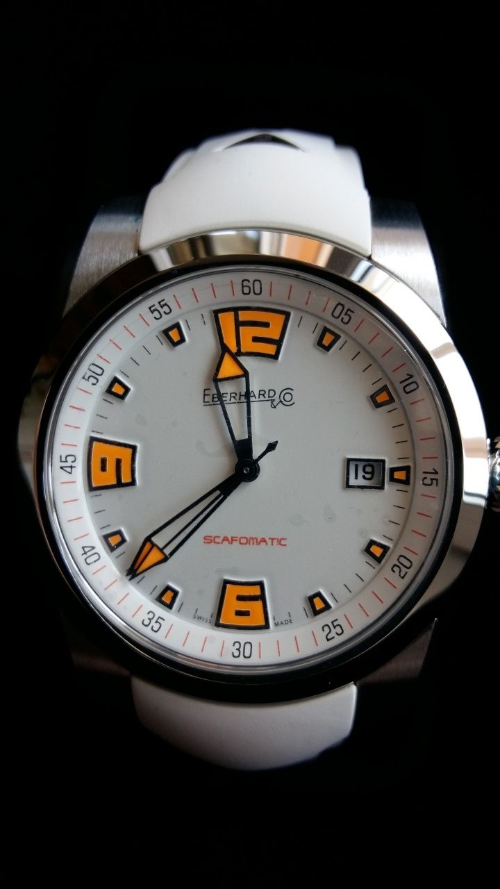 Цвет циферблата: Белый циферблат, рельефные арабские цифры и индексы, с оранжевым люминесцентным покрытием и родиевыми контурами.