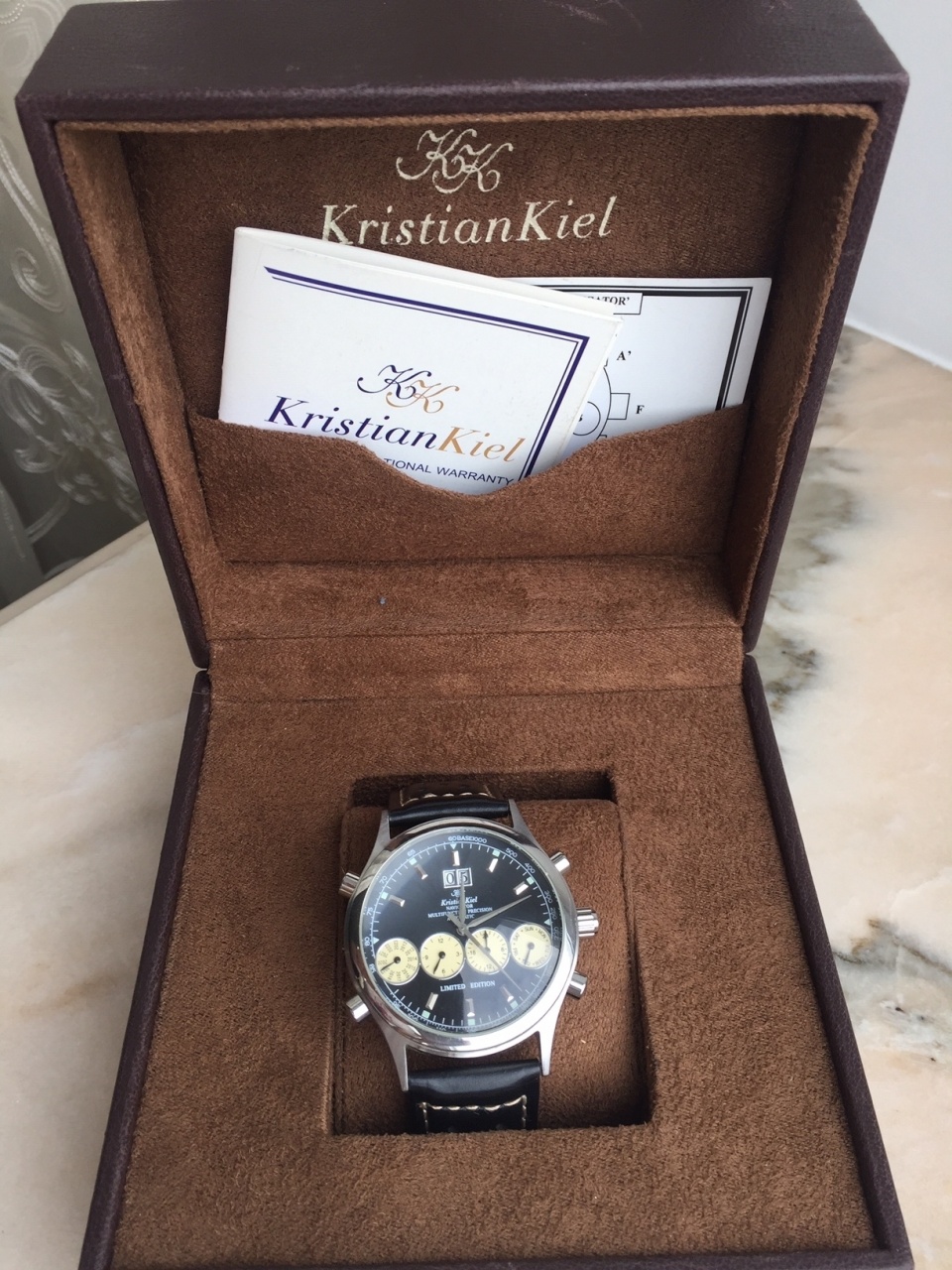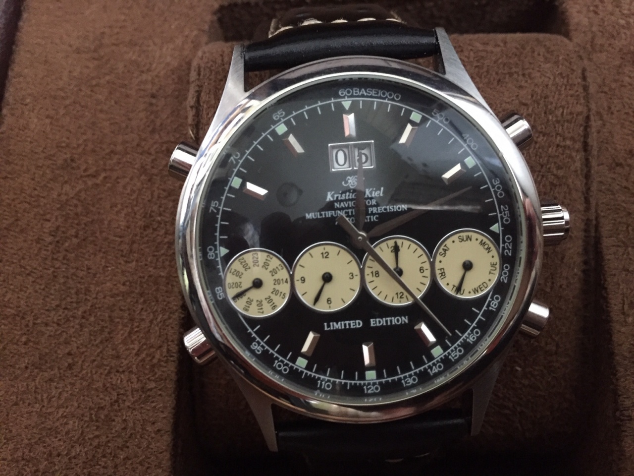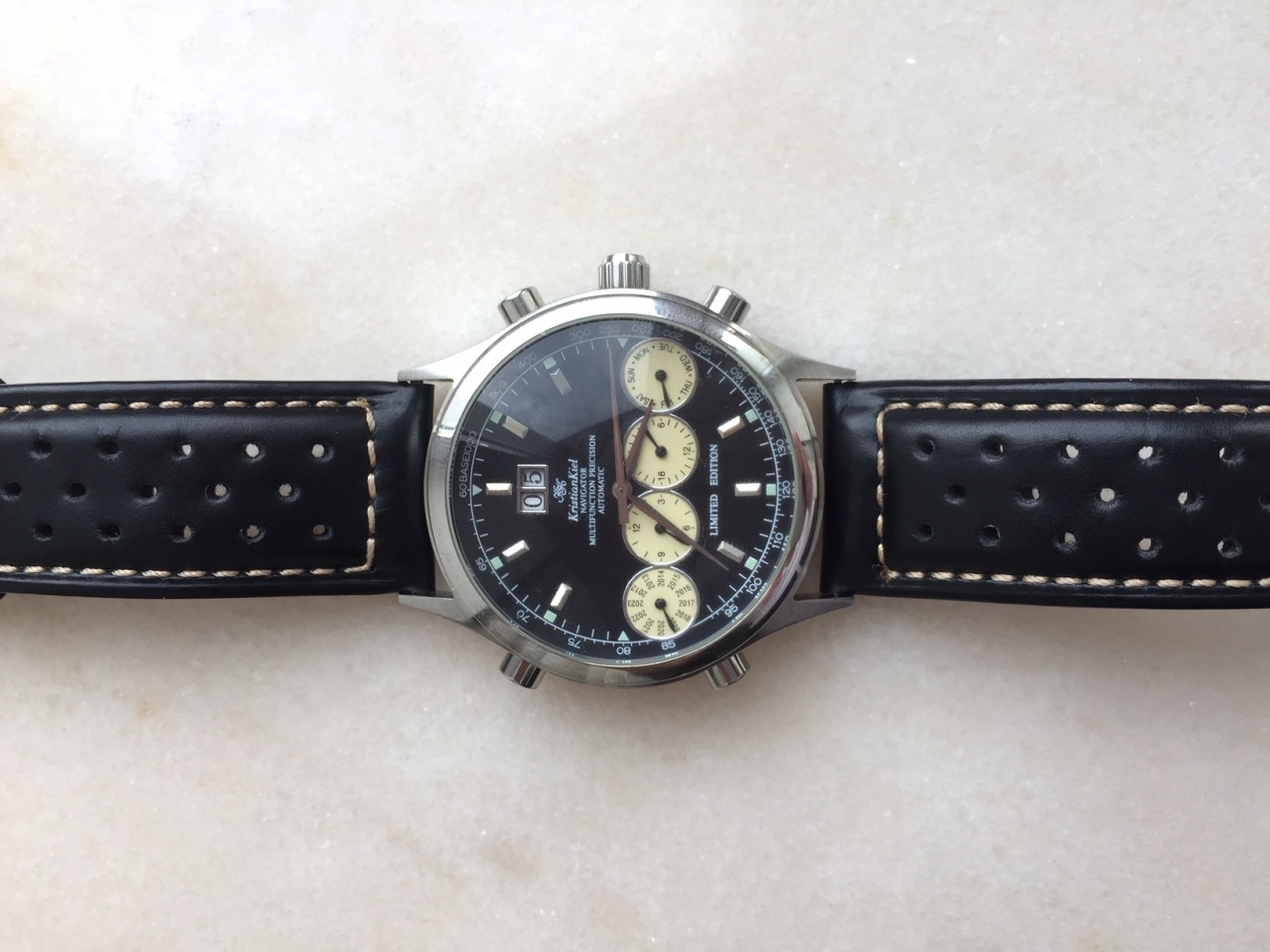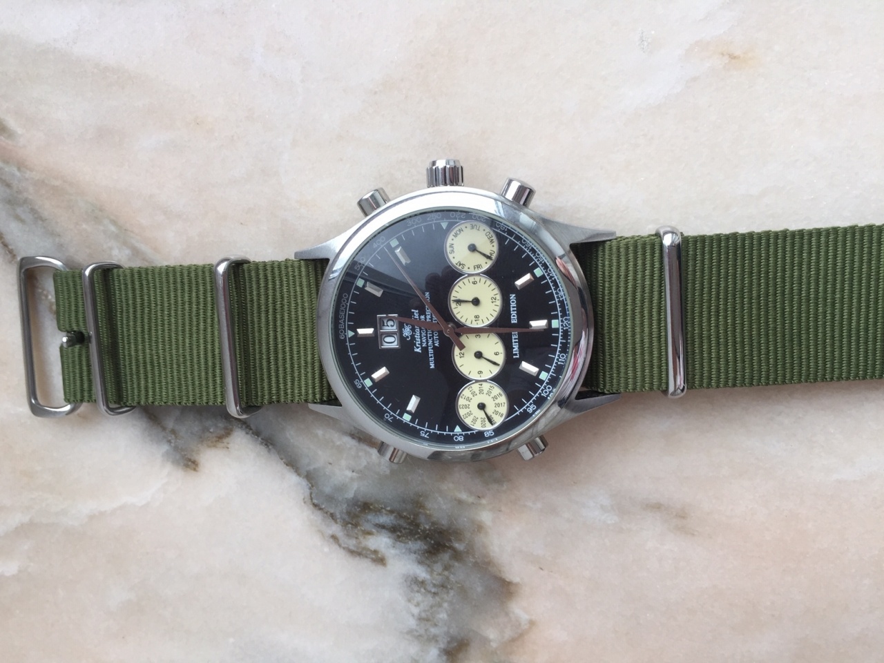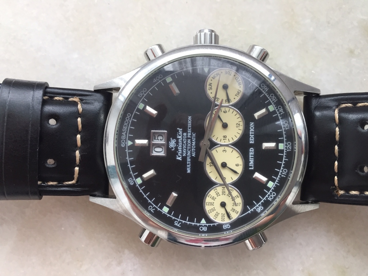 мех. часы с автоподзаводом часового дома Kristian Kiel, модель Navigator. Размер корпуса 44 мм , ремешок 24 мм. Изогнутое оптическое стекло, календарь c двумя отдельными цифрами. Дизайн циферблата близок к классической модели часов Ferrari, сейчас Navigator в данном этом больше не выпускается (см сайт производителя). Часы из своей коллекции, носил очень редко, состояние новых. Куплено в Испании, бонусом дополнительно ремешок NATO. Возможна небольшая скидка.