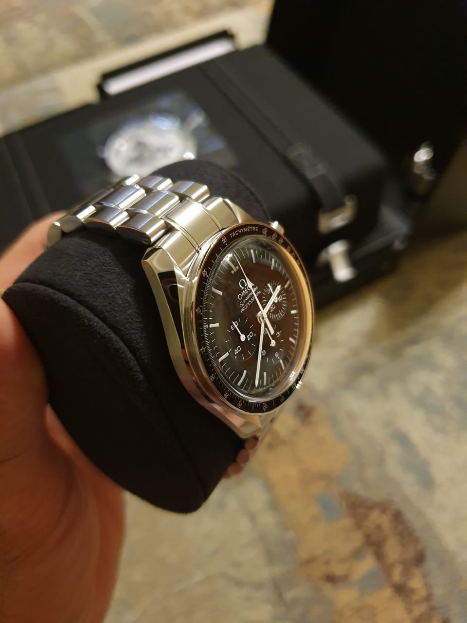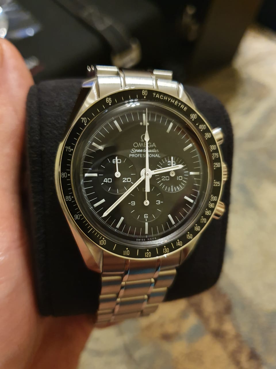 Эта модель OMEGA Speedmaster Professional "Moonwatch" имеет черный циферблат с устойчивым к царапинам сапфировым стеклом, малой секундной стрелкой, 30-минутным и 12-часовым счетчиками, центральной стрелкой хронографа. Черный безель с тахиметрической шкалой закреплен на корпусе диаметром 42 мм из нержавеющей стали. Часы дополняет стальной браслет.