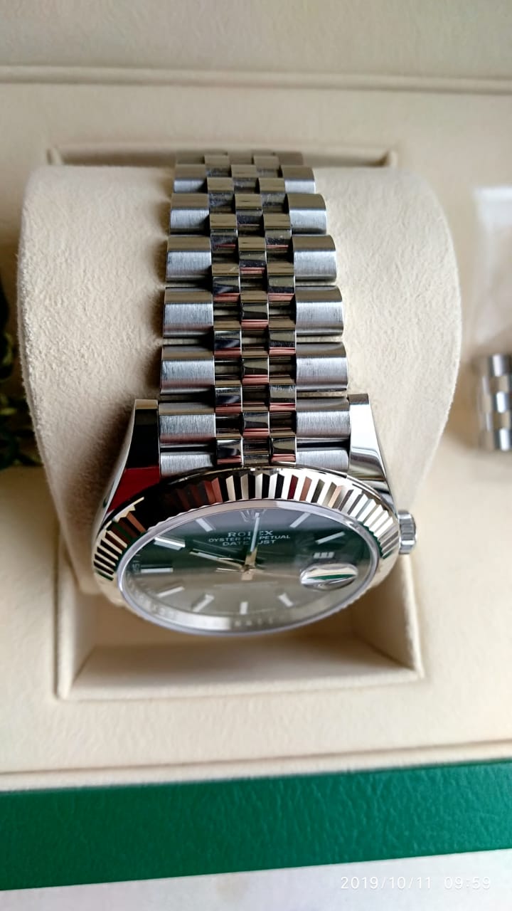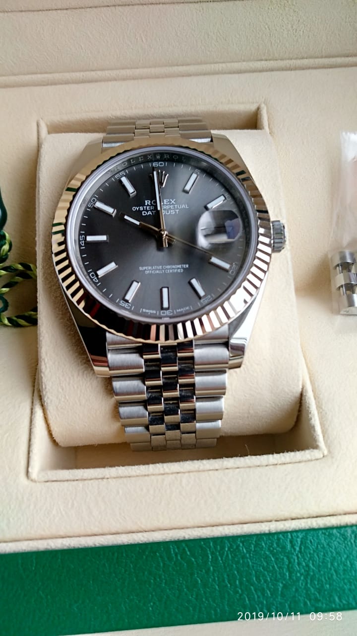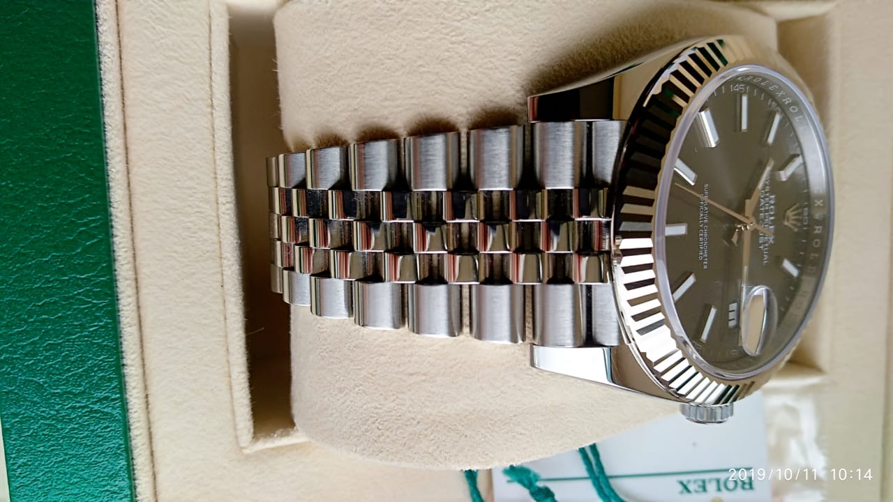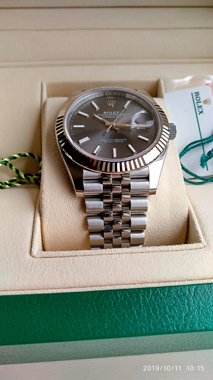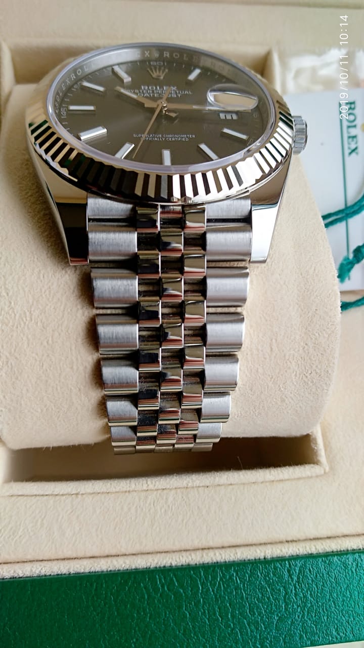 В продаже классическая модель Rolex Datejust 41 mm c рифленым безелем из белого золота, циферблатом цвета dark rhodium на юбилейном браслете.