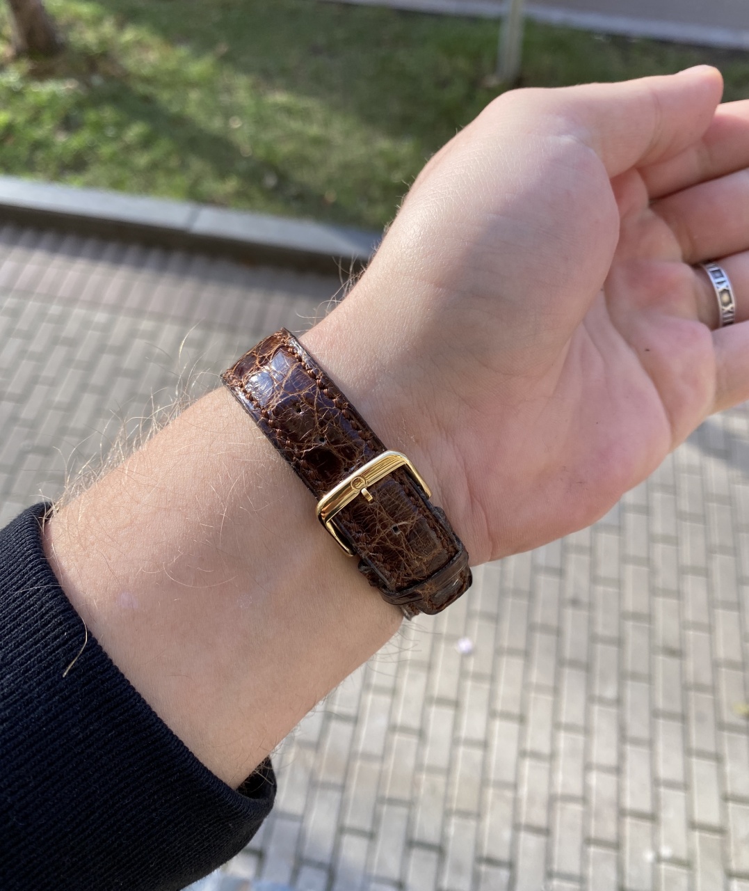 Потрясающий классический Speedmaster , одевались несколько раз! Ремень оригинальный , потемнел от времени следы носки минимальны! Так как часы никогда не полировались надписи на безеле в потрясающем состоянии! Застежка золотая какая и должна быть! Найти в таком же состоянии эти часы невероятно!