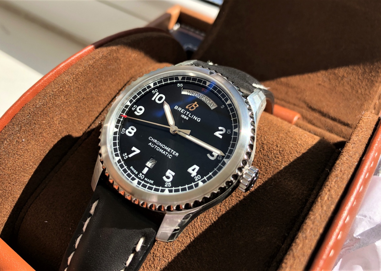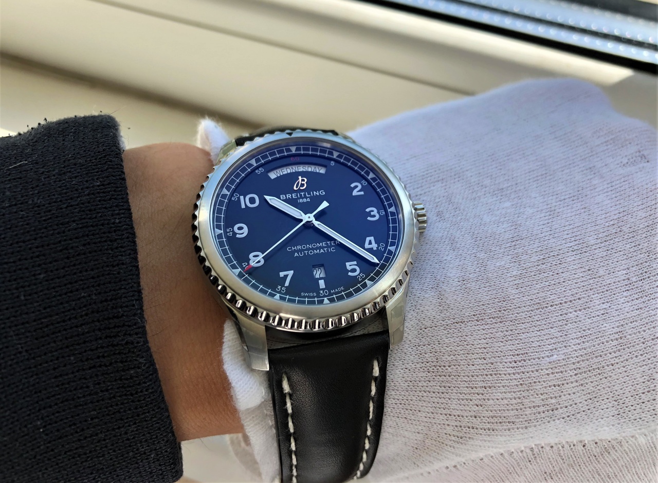 с интересным усложнением в виде "день-дата" в универсальном диаметре 41мм, на кожаном ремне.