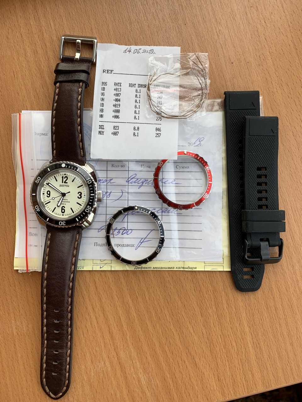 В комплекте: сами часы, силиконовый ремешок от часов Garmin Fenix (отлично подходит), два новых оригинальных безеля красный и черный с комплектом запасных держателей, так же на часах стоит оригинальный безель из керамики!!! Документы и коробка утеряны(