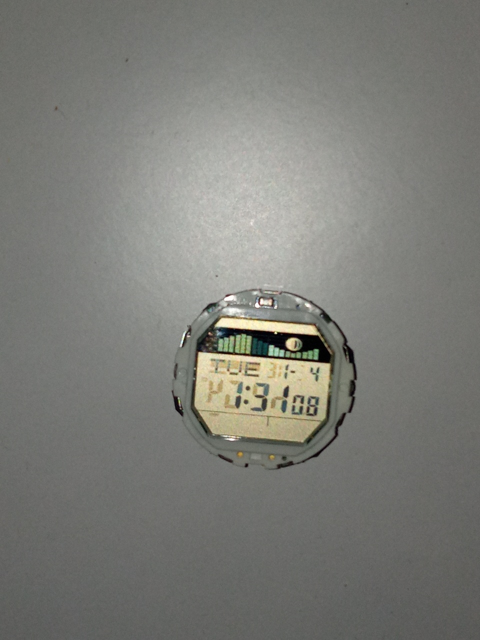 Замена дисплея - это повреждение сегментов постоянным напряжением (вместо переменного). Предыдущий владелец вставил батарейку, не сделал сброс и продержал часы в таком состоянии не меньше нескольких суток. Другой вариант - в модуль попала вода, кварцевый генератор остановился, а питание продолжало подаваться на дисплей. Менее вероятно - плохой контакт в одном из общих проводов дисплея (в самом дисплее или под ним), в результате чего на соответствующие сегменты постоянно подавался некорректный сигнал.