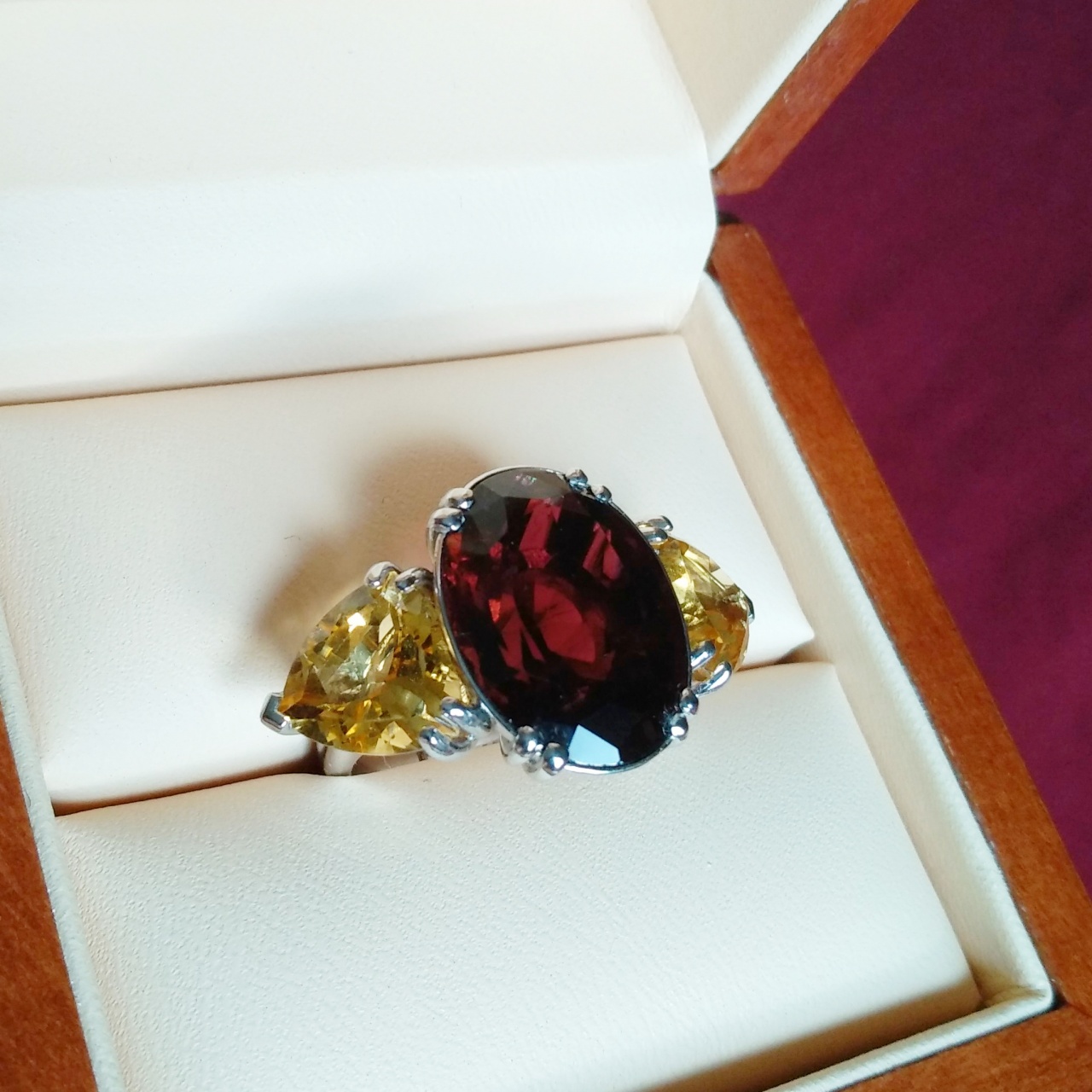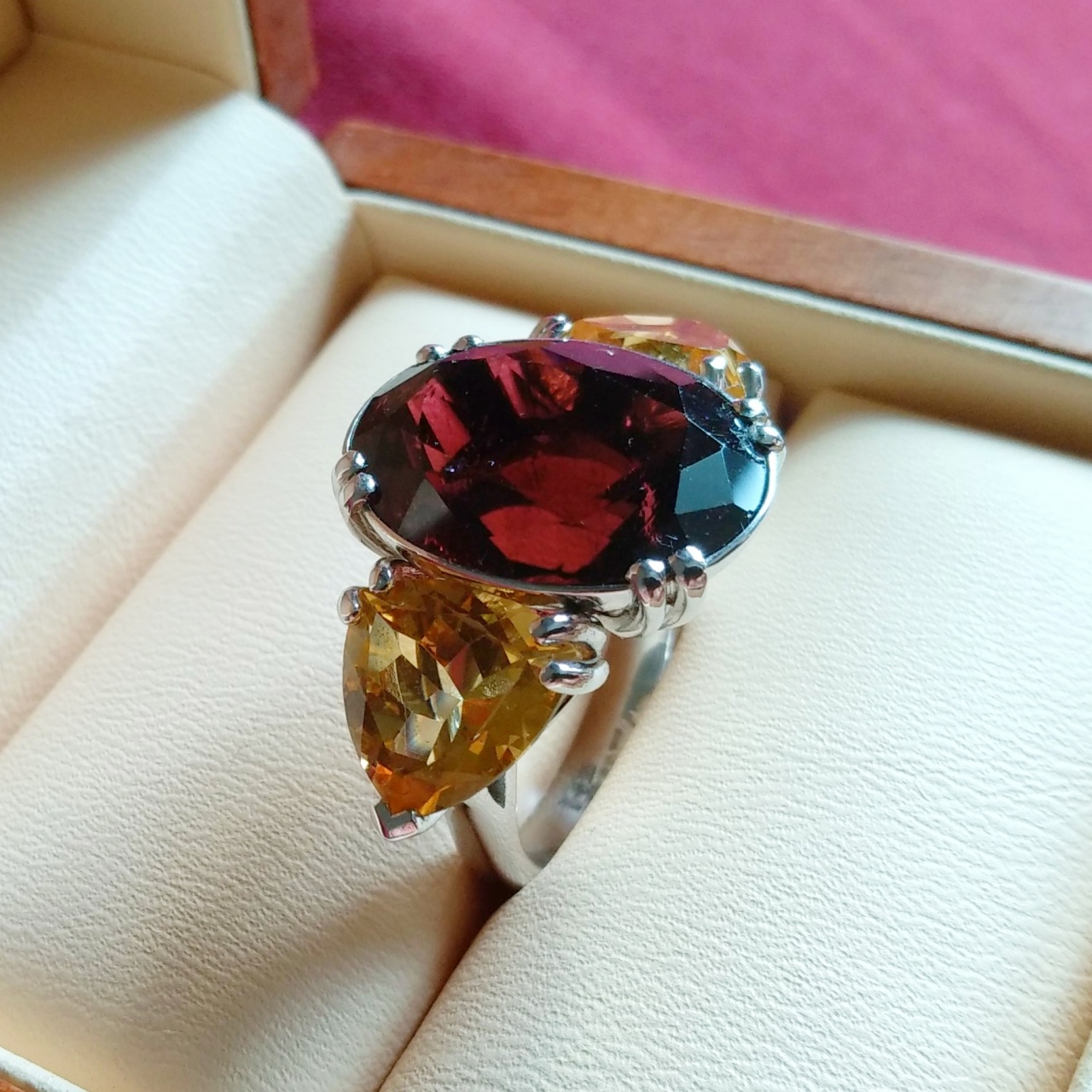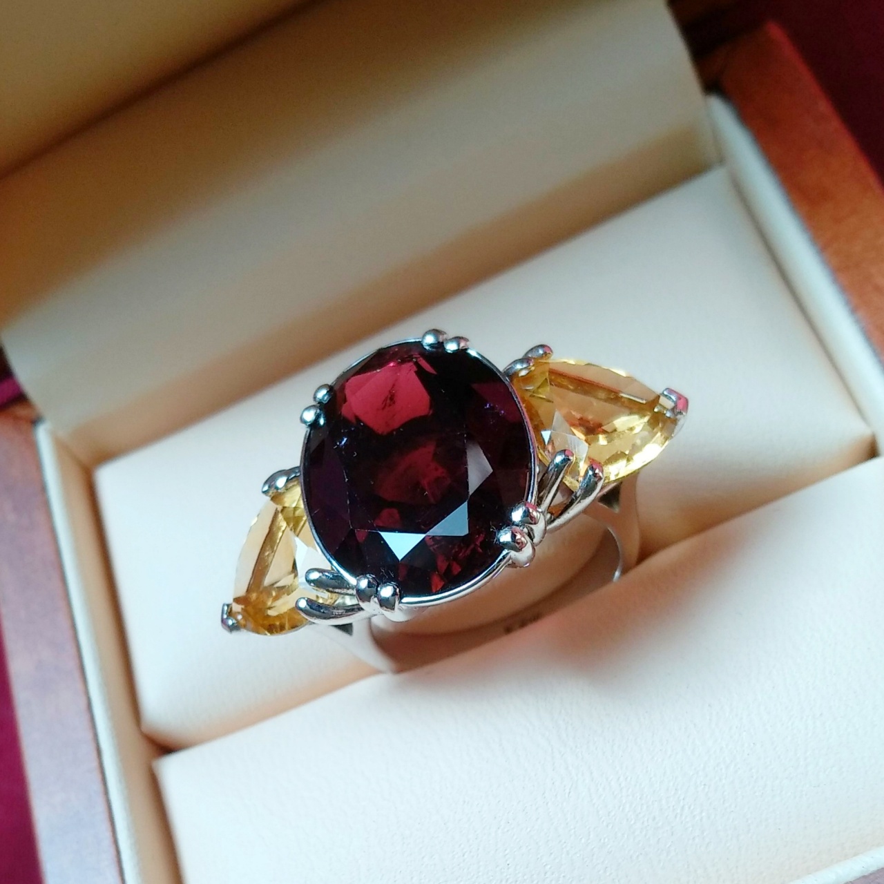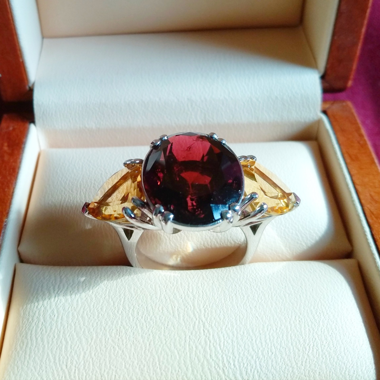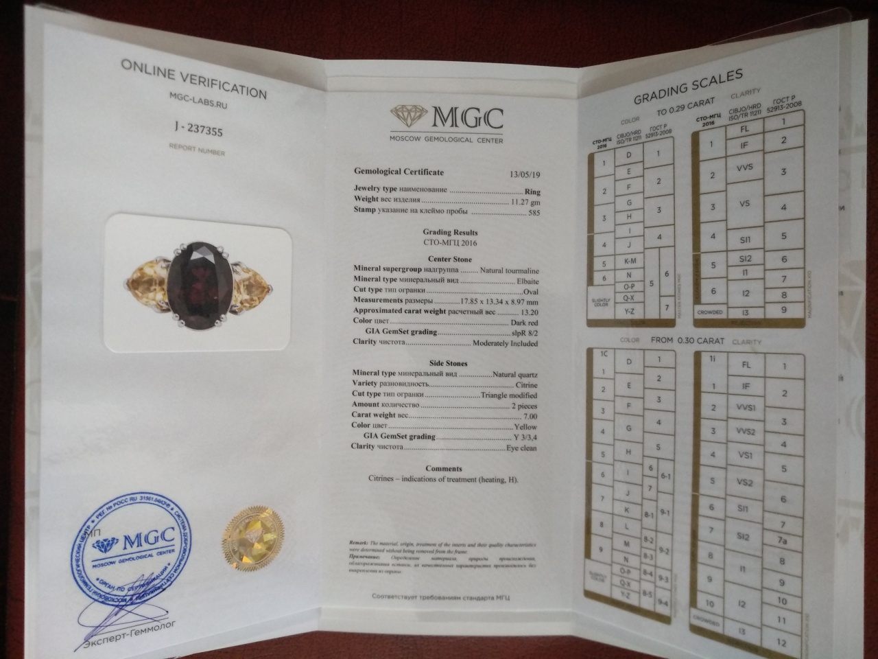 Белое золото. Натуральный, не облагороженный турмалин рубеллит, весом 13,2 карата. Это одна из самых дорогих разновидностей турмалина, дороже только параиба. По бокам цитрины. Размер 17. При необходимости можно изменить. Сертификат в комплекте. Есть возможность онлайн верификации сертификата по номеру, на сайте лаборатории. На последнем фото цены на аналогичные камни меньшего размера и не оправленные в изделия.