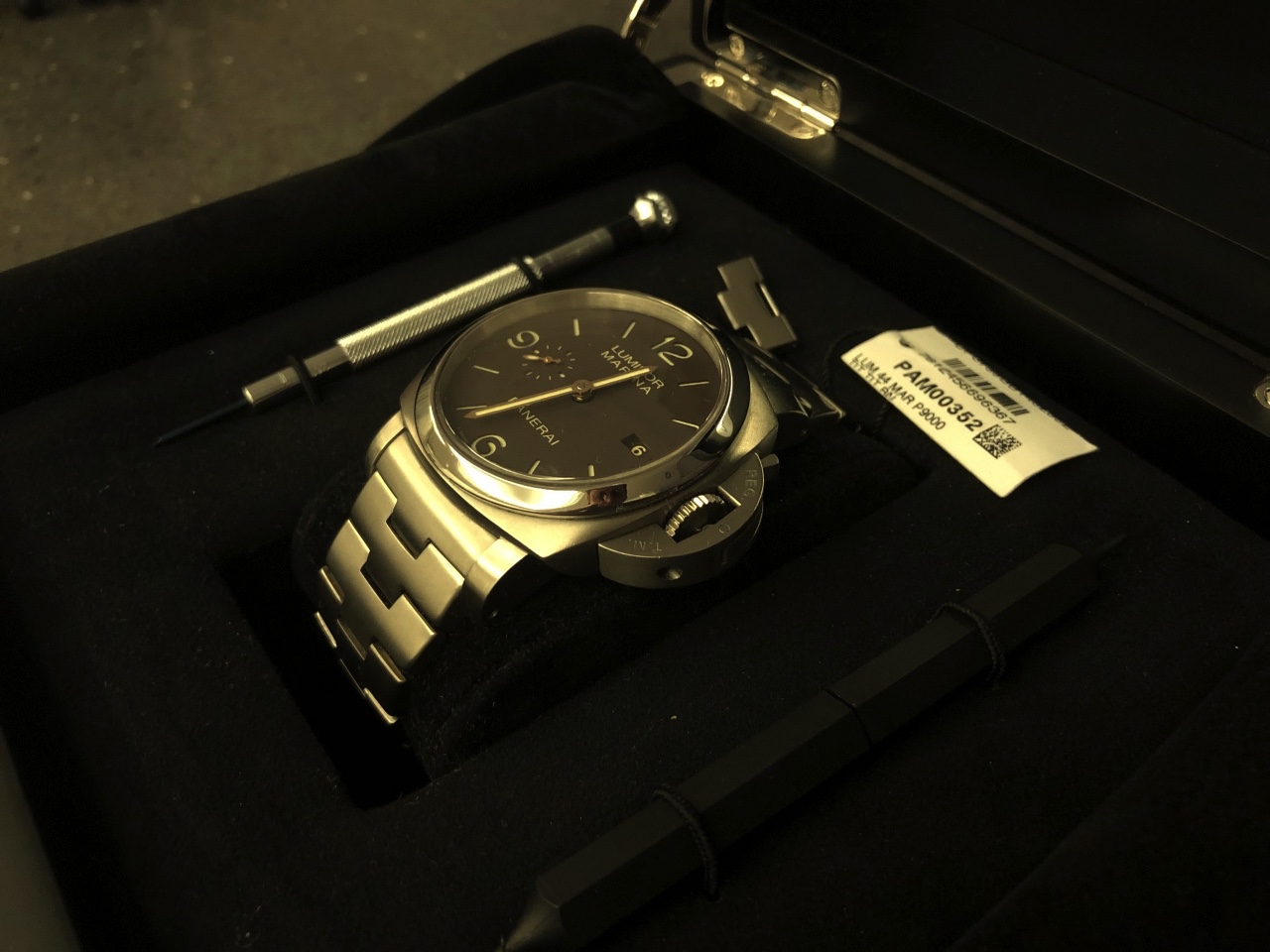 РЕМЕШОК: Фирменный титановый браслет PANERAI с вертикальной матовой отделкой и полированными поверхностями между звеньями. Пряжка из титана и стали. Поставляется с инструментом для замены браслета и стальной отверткой.