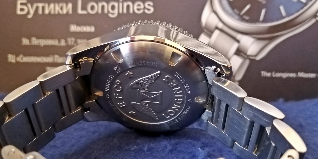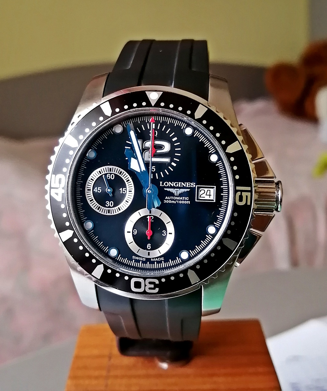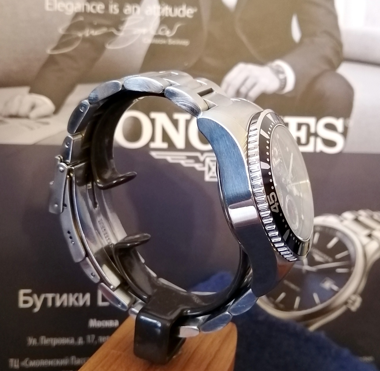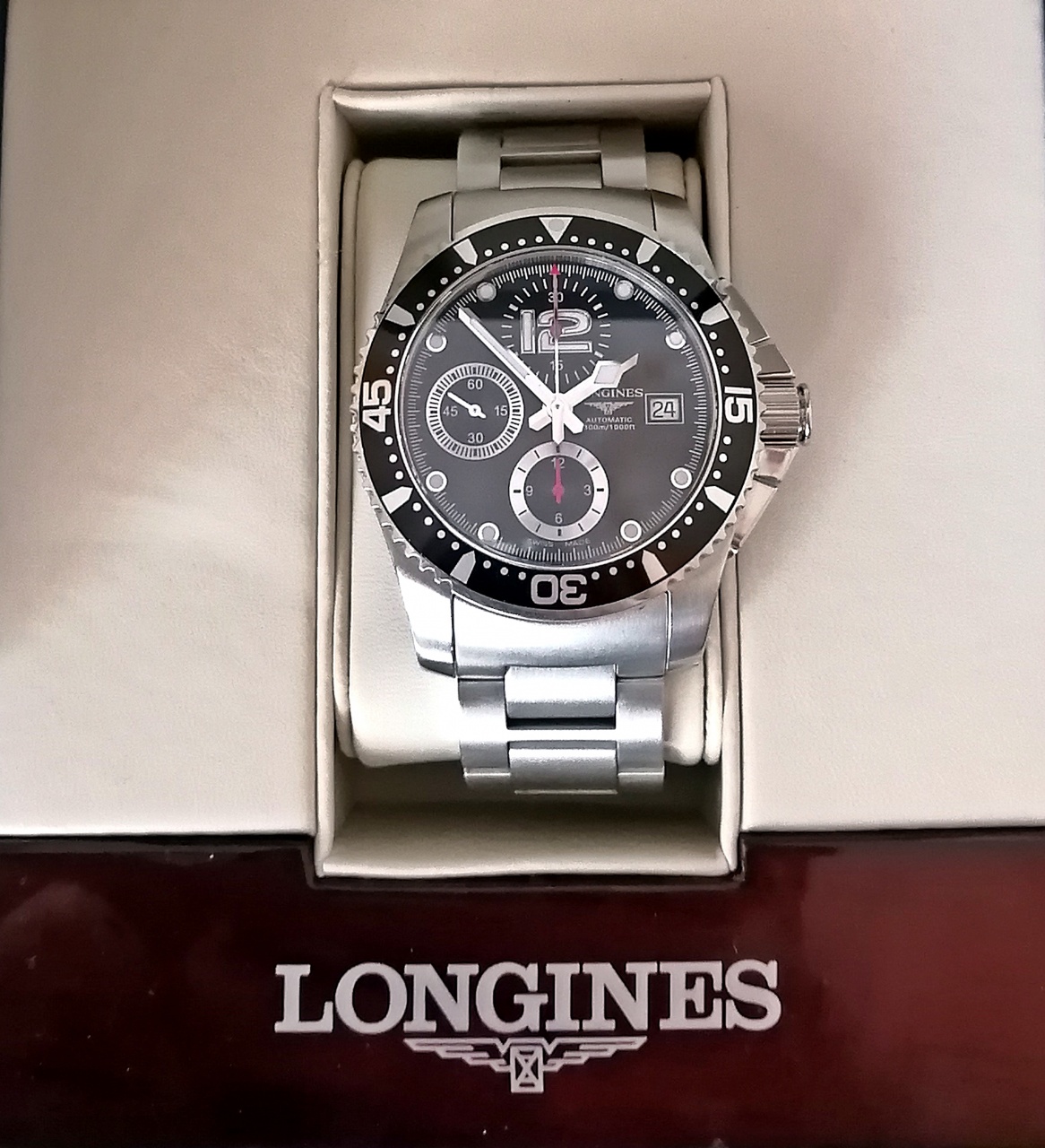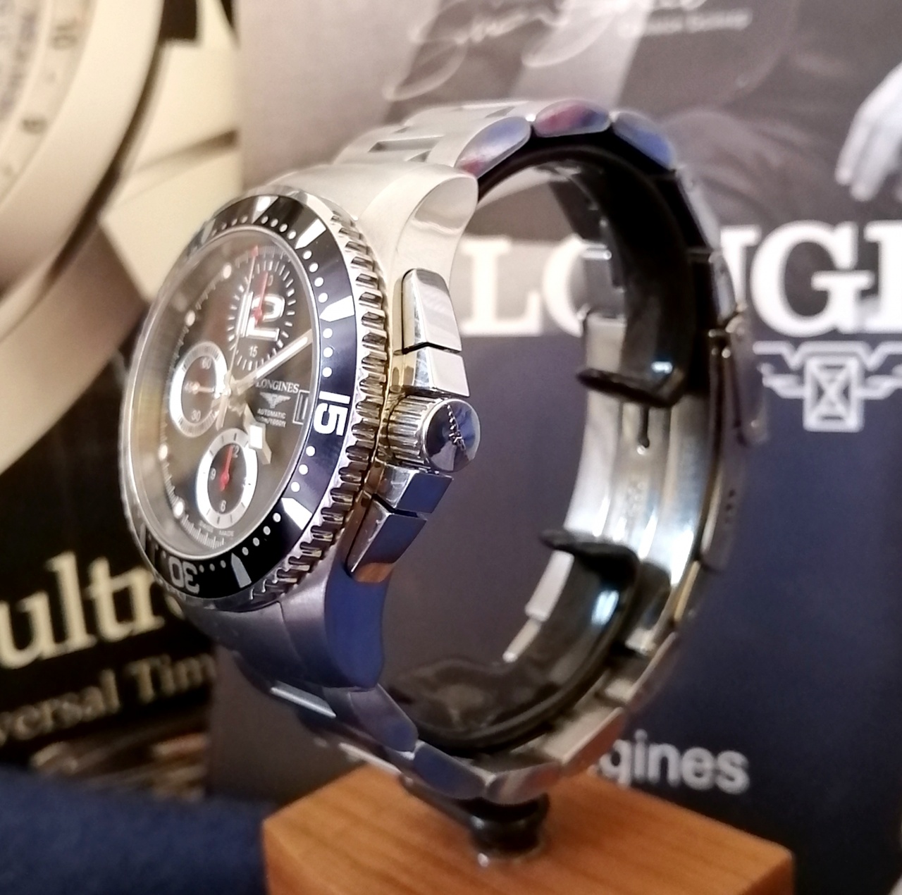 В продаже мужские часы Longines Hydroconquest L3.644.4. Часы в прекрасном состоянии. Механика с автоподзаводом, хронограф, сапфировое стекло с антибликовым покрытием, дата, браслет и каучуковый ремень в комплекте. Часы не полировались, браслет полирнул в мат, выглядит супер. В комплекте: коробка, книжка, часы, оригинальный каучук с ориг. застёжкой + доп. звено к браслету, карты нет. Ход отличный, 0 сек/сутки показали в виндере. Фото на руке ~ 19см.
