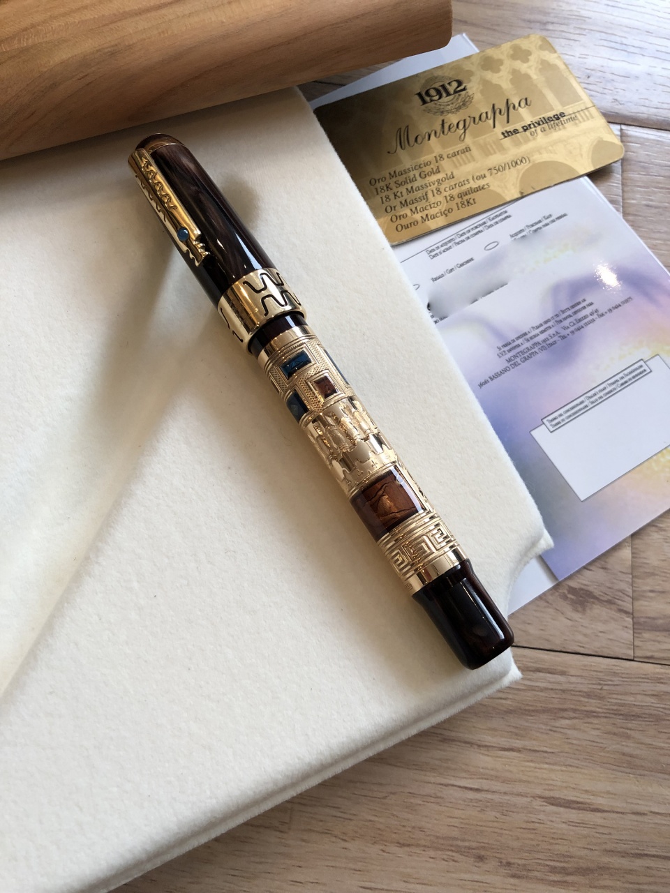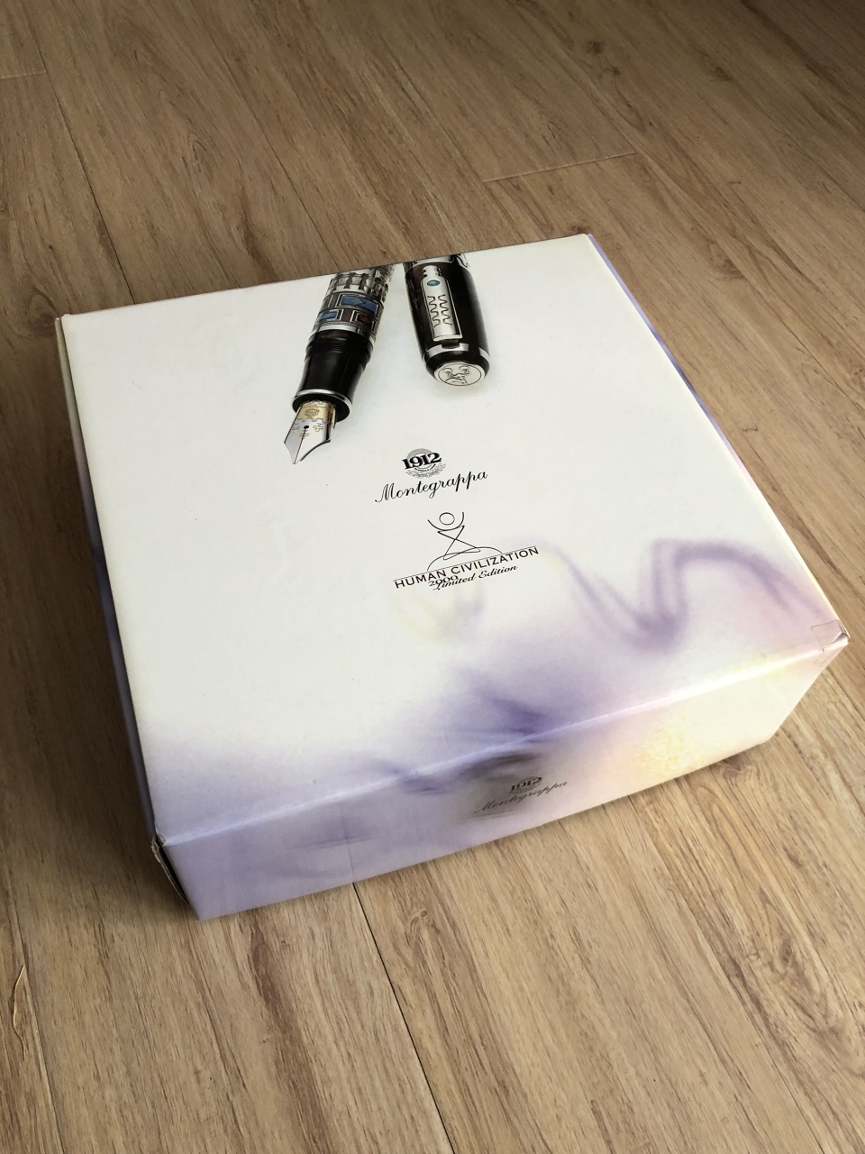 Издание "Человеческая Цивилизация" представлено в ограниченном количестве пронумерованных изделий: 1912 перьевых ручек из смолы и стерлингового серебра и всего лишь 100 из смолы и золота 18K. Каждое изделие украшено низкорельефной гравировкой, которая становится особенно ценной благодаря ручному эмалированию: плод трудоемкой и длительной работы. Изображение Адама на центральной картине выполнено с помощью особой техники цветного эмалирования, благодаря которой в конечном итоге все краски сохраняют яркость на общем рисунке. Клип выполнен при помощи пресс-литья, дополнен отделкой вручную и украшен "агатовым" кабошоном. Золотое перо 18К частично покрыто платиной и украшено гравировкой, имеется четыре размера. Модель снабжена поршневым наполнителем и эбонитовым фидером, обеспечивающим свободную подачу чернил. Все детали, выполненные не из драгоценных металлов, изготовлены из перламутровой ярко-коричневой смолы.