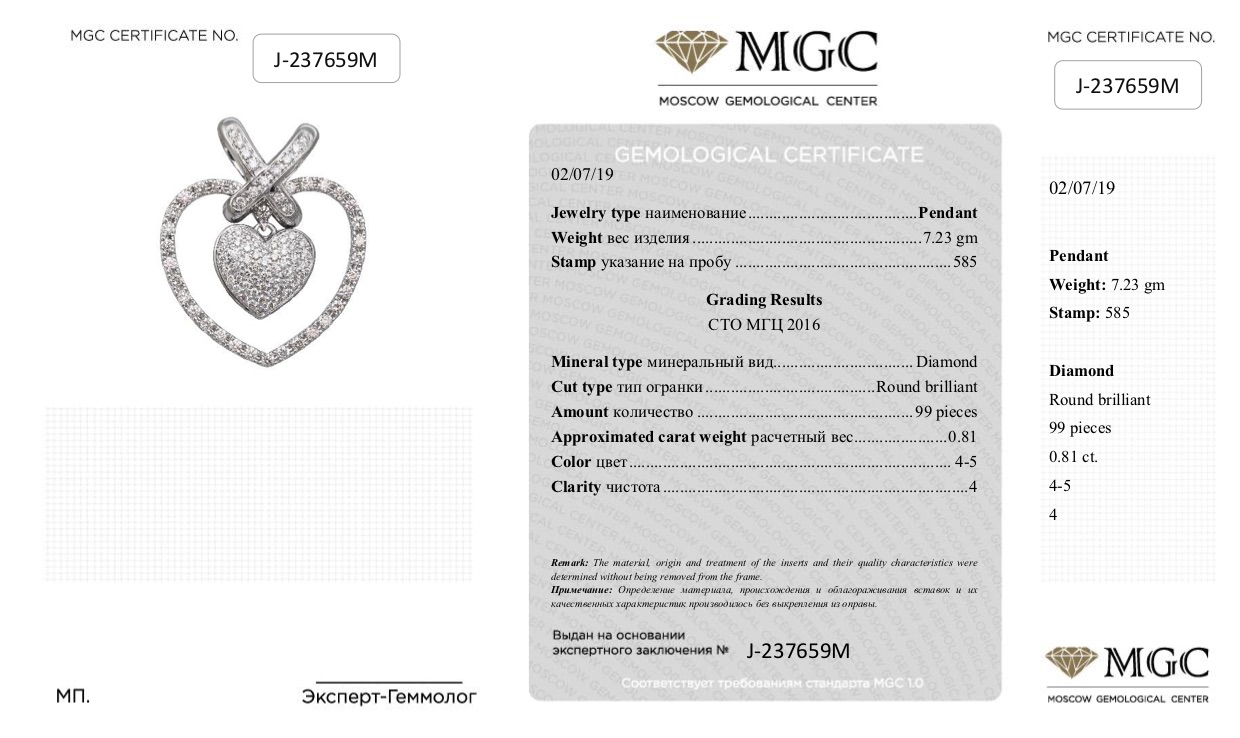 Подвеска из белого золота с бриллиантами 0,81 карат (сертификат МГЦ)