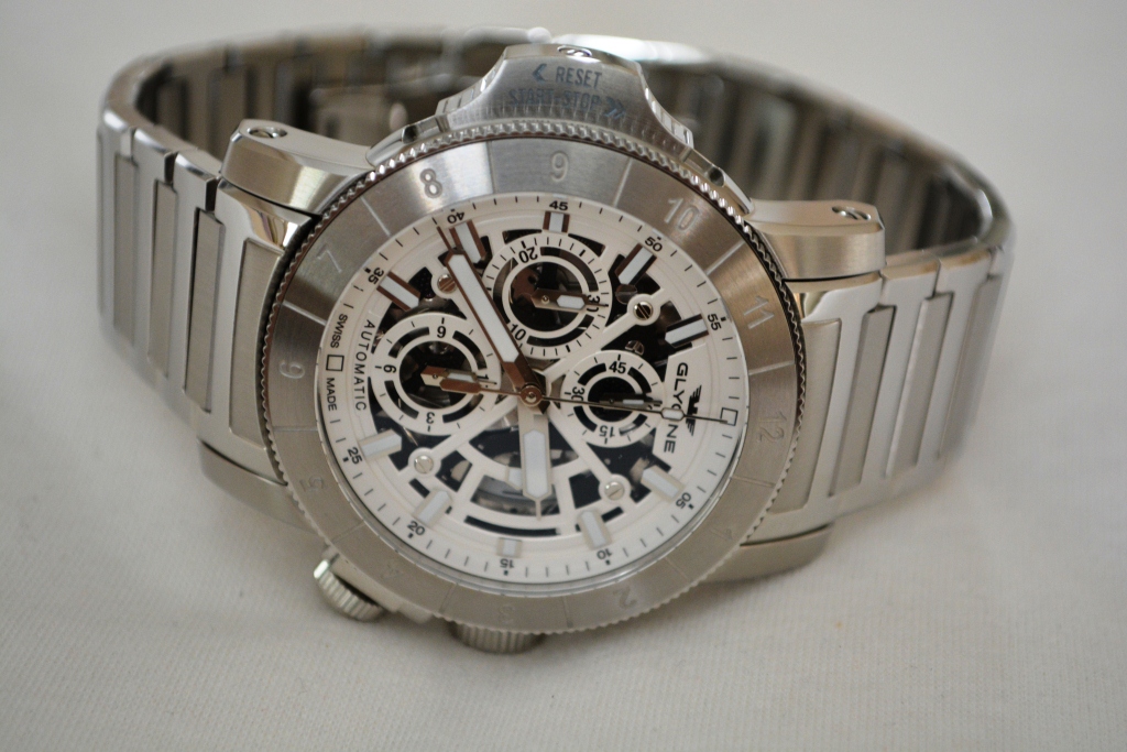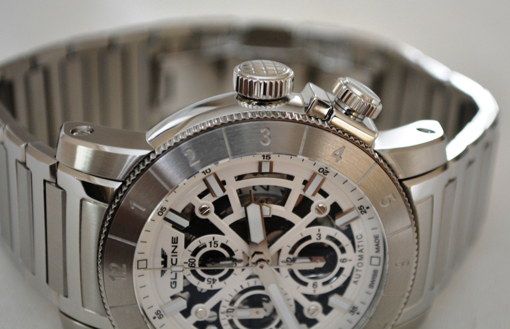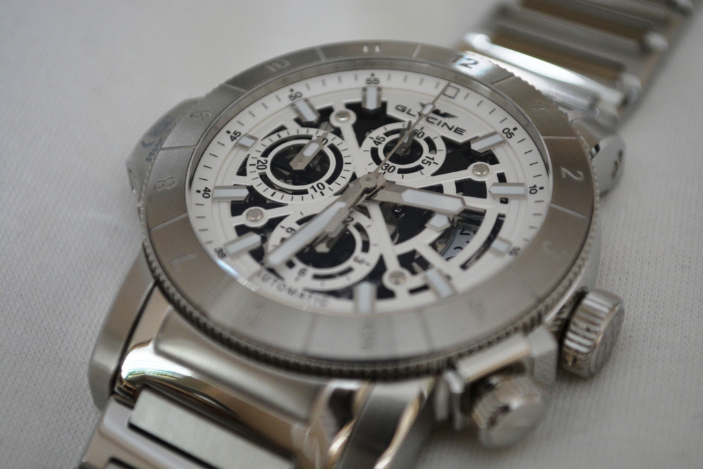 Белый скелетонизированный циферблат с накладными метками. Окошко даты в положении 3 часа