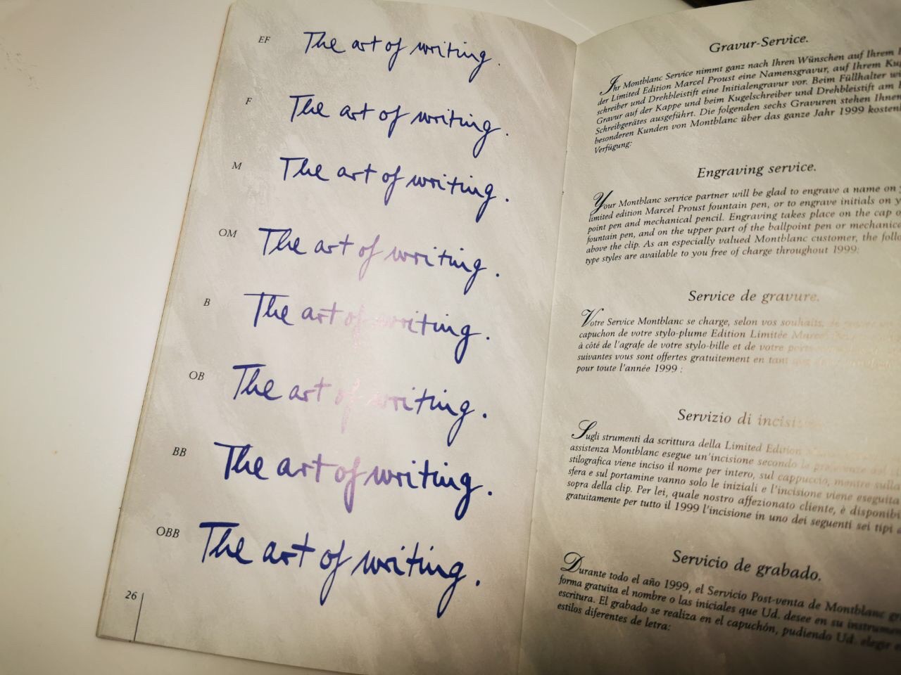 Будучи великим писателем и мыслителем, Марсель Пруст всегда стремился к максимальной глубине детализации и точности - стремлению, которое разделяет издание для любителей творчества автора. Восьмисторонний ствол с его тонкими гравюрами напоминает стиль, преобладающий в самый творческий период Пруста, и, как и оправы, состоит из серебра 925 пробы.