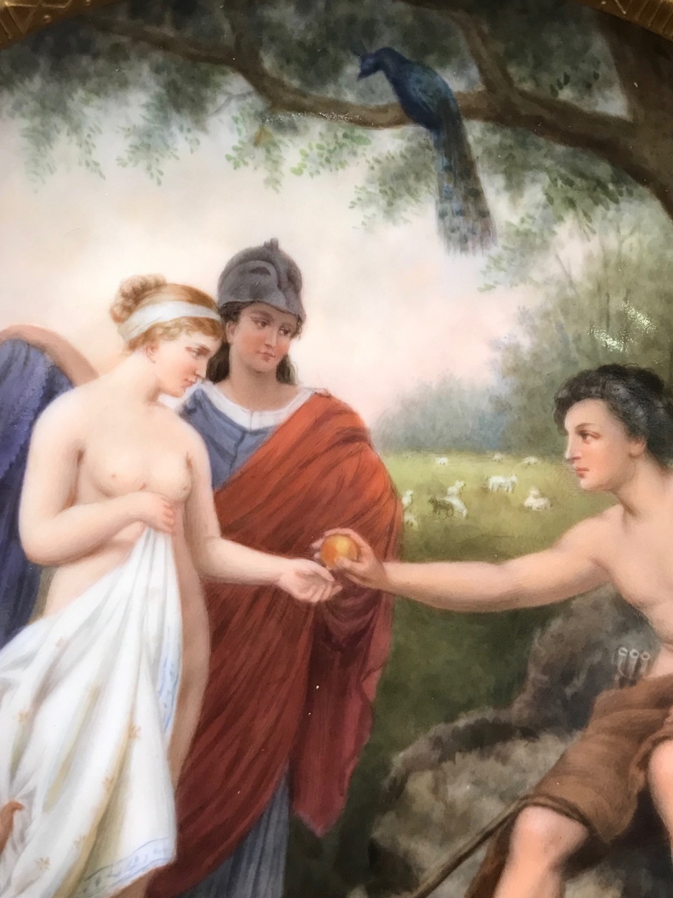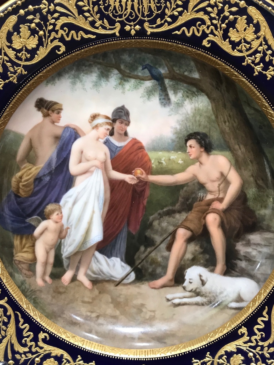 Перед нами декоративная тарелка «Суд Париса» — сюжет древнегреческой мифологии о пасторальном конкурсе красоты, на котором пастух Парис выносит свой вердикт трём богиням.