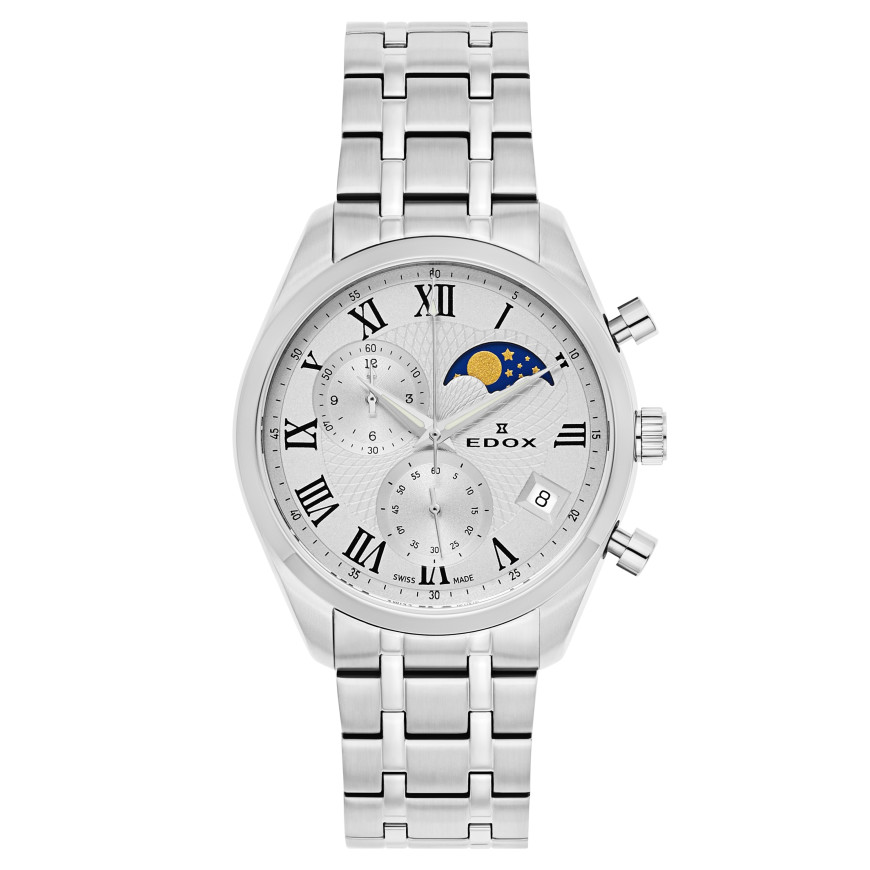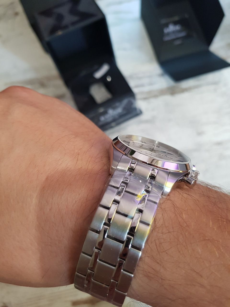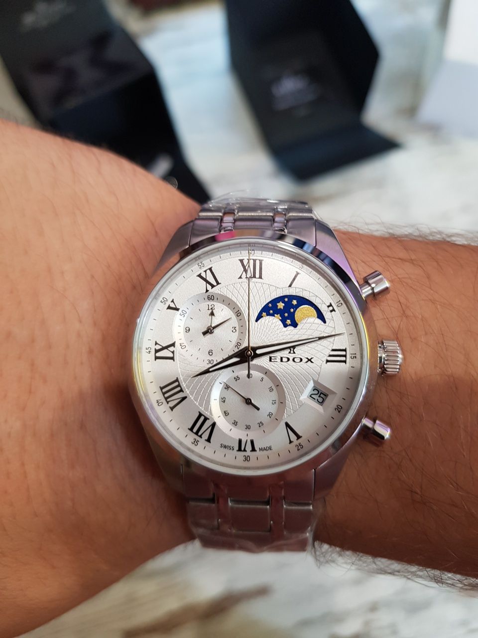 Не скучный циферблат с гильоше, идеальная читаемость времени, интересное сочетания матовой и полированной стали. Фазы луны. Хронограф. Идеален для повседневной носки под джинсы или костюм. Отличное качество отделки корпуса и браслета. На руке смотрятся строго и дорого.