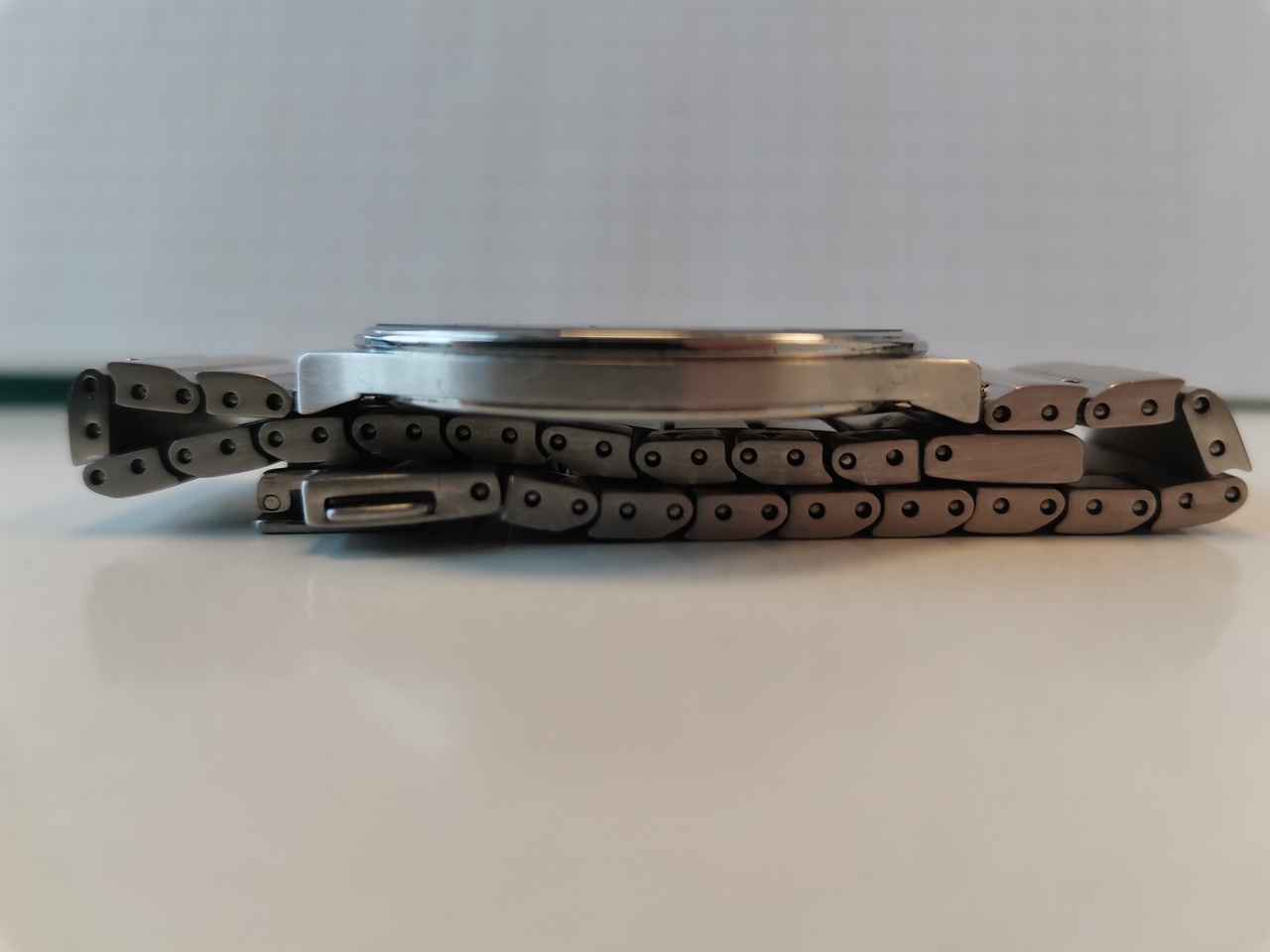 Стальной браслет, по ощущениям литой, нестандартный. На ремень не пересадить. Застежка не очень удобна, но компактна.