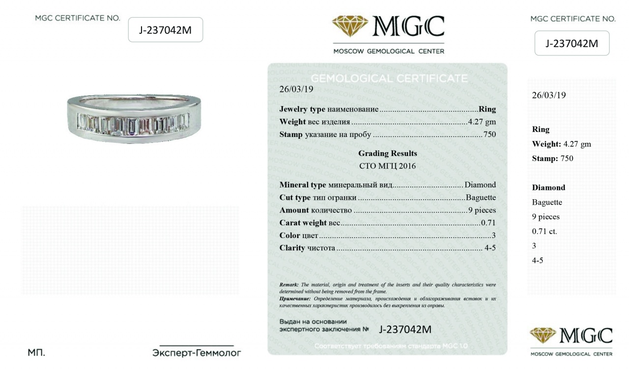 Обручальное кольцо из белого золота с бриллиантами 0,71 карат (сертификат МГЦ)