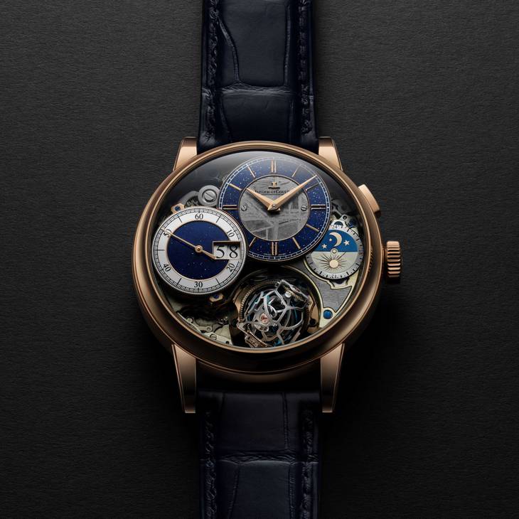 Новая флагманская модель Master Grande Tradition Gyrotourbillon 3, выпущенная лимитированной серией из 8 экземпляров, привычно сочетает фирменный гиротурбийон третьего поколения и хронограф с необычной цифровой индикацией минут. На этот раз, впрочем, изделие декорировано сразу в нескольких традиционных техниках, включая ручное гильоширование, гравировку и горячую эмаль. Корпус диаметром 43,5 мм и детали циферблата выполнены из розового золота. Ряд передних мостов и центральная часть регистра основного времени покрыты узором из метеорита, внешний диаметр последнего также обрамлен темно-синим авантюрином с накладными индексами. Секундный счетчик хронографа в положении «9 часов» оформлен вставкой из авантюрина и белой эмалью с индексами. На нем же расположено окошко, отсчитывающее минуты.