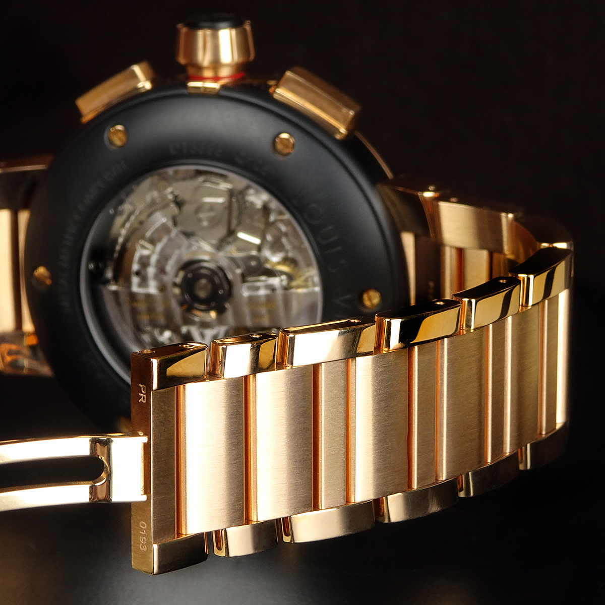 - Механизм: автоматический хронограф калибра LV92 на базе ETA/Valjoux в топовой версии со специальными доработками по спецификациям Louis Vuitton. У Louis Vuitton в ассортименте есть уже масса собственных мануфактурных калибров, но в данном случае механизм на базе Valjoux это плюс - лучший хронограф в мире, проверен временем и надежен, и на обслуживание, когда оно понадобится, часы можно отдавать не обязательно к официалам.