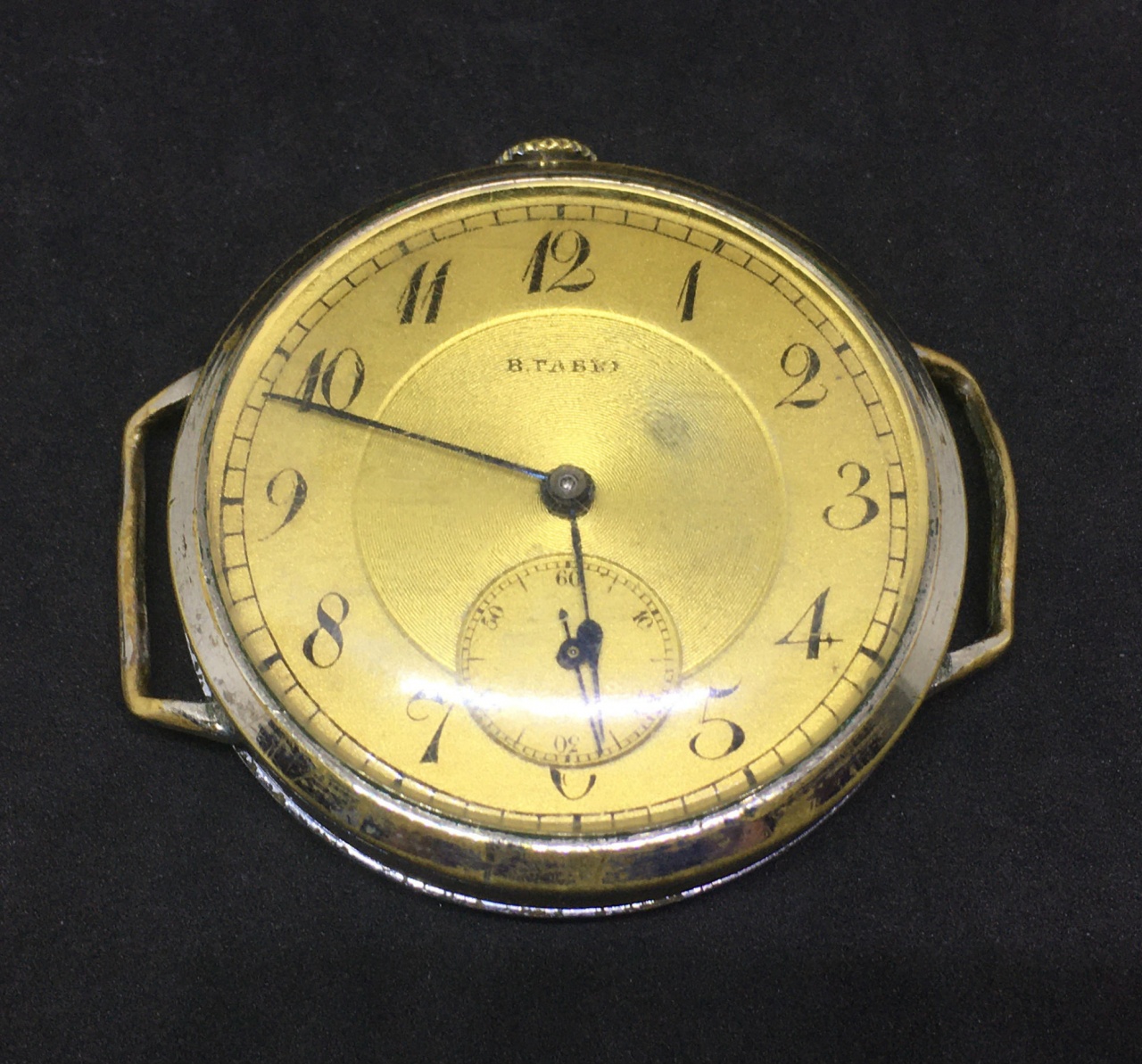 Здравствуйте, попались вот такие часики В. Габю - наручные, механизм работает отлично, циферблат хороший, нужна полировка стекла. Диаметр корпуса 44 мм; с ушами - 51 мм