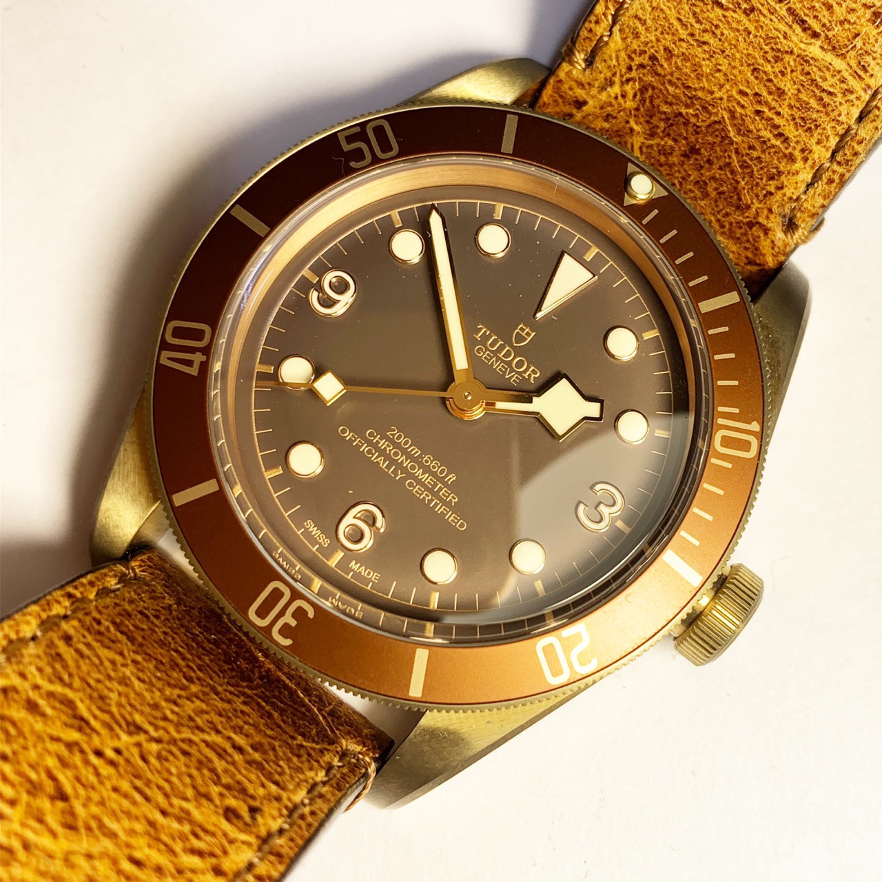 Циферблат выполнен из бронзы со светящимися кружками и метками часов дротиков, светящимися арабскими цифрами на 3, 6 и 9 часах, по шкале периметра минуты / секунды. Он имеет светящиеся стрелки «снежинки» с ромбовидной стрелкой на часовой стрелке, а также центральную секундную стрелку с алмазным индикатором. Он имеет сертифицированный официальный рейтинг превосходного хронометра (COSC), 70-часовой запас хода при полном ветре и водонепроницаемость до 200 метров. Корпус, циферблат и механизм толщиной 12,5 мм подписаны.
