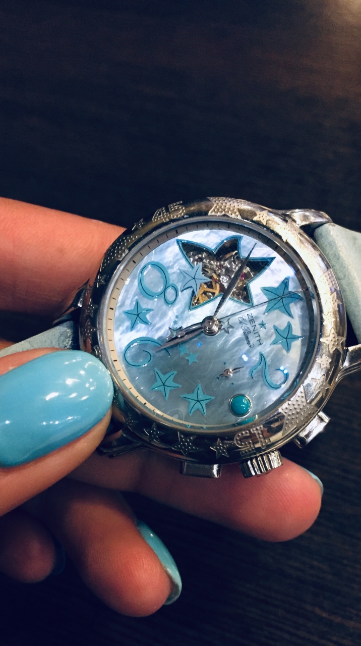 Модель идеально подходит для женщин, которые ценят свой неповторимый стиль и являются поклонниками эксклюзивных вещей. Никто не останется равнодушным при виде часов из коллекции от мирового производителя часов Zenith, каждая деталь которых поражает своим качеством. Изготовленный из нержавеющей стали корпус часов, имеет размер 37,5 мм. Корпус часов толщиной 13,5 мм. Механизм с автоматическим подзаводом работает от амплитуды движения руки. Часы предназначены для того, чтобы в них плавали и имеют водонепроницаемость 100 м. Циферблат закрыт прозрачным антибликовым стеклом из сапфирового хрусталя высокой прочности, благодаря чему обеспечивается максимальная