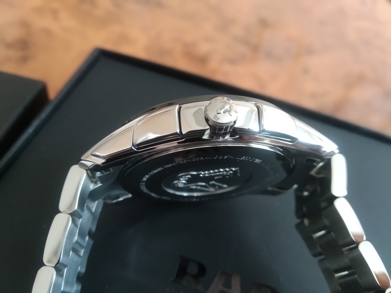 Корпус: сталь+керамика, диаметр 45 мм, сапфировое стекло с антибликовым покрытием, водонепроницаемость 100 м