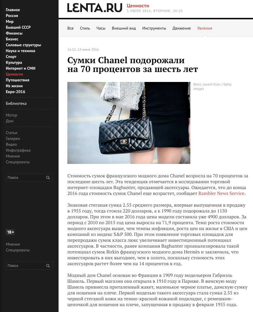 Согласно американским исследованиям, проведенным еще в 2016 году, темп роста стоимости сумок Chanel выше чем темпы инфляции, роста цен на жилье в США, и цен компаний из индекса S&P 500. И это так и есть.