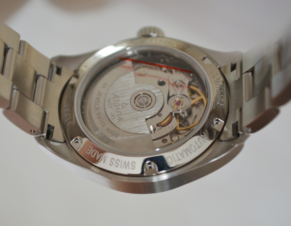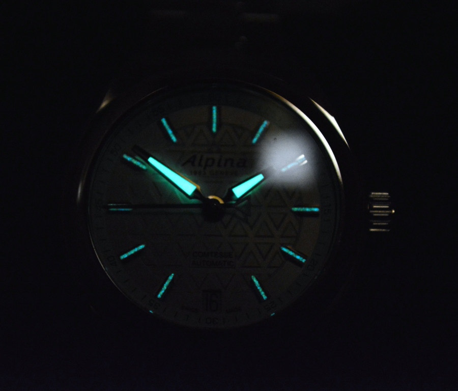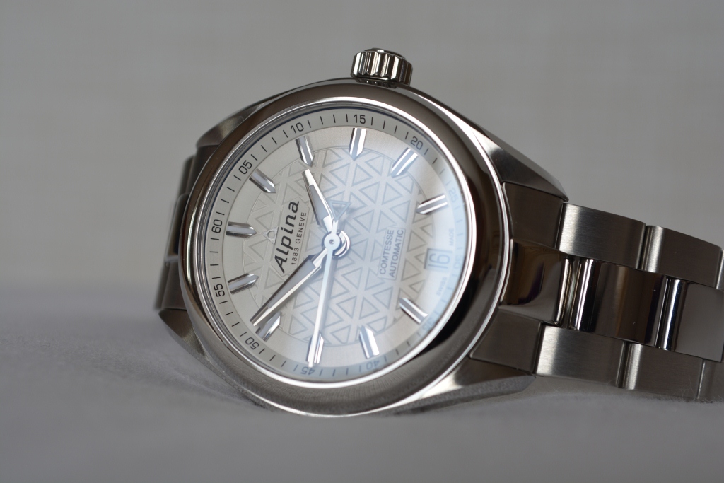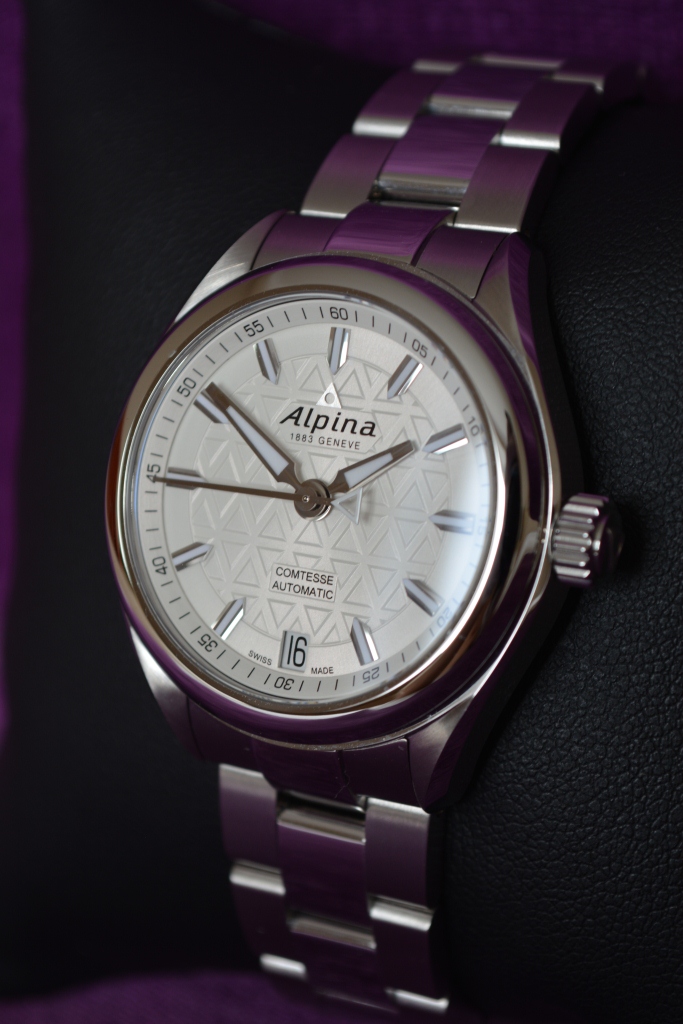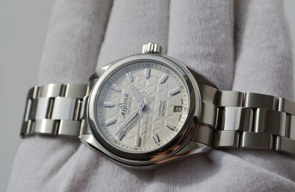 Белый гильошированный циферблат с накладными блестящими метками и логотипом. Окошко даты в положении 6 часов