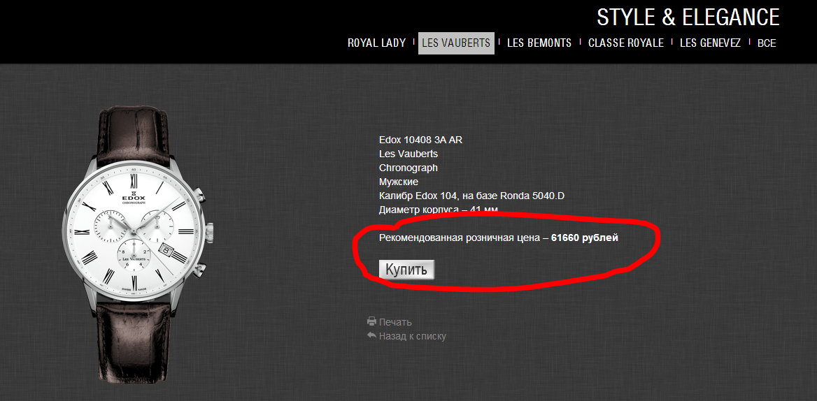 Edox - мануфактура с почти 130 - летней историей. Мануфактура находится в Ле Женеве, Швейцария. Само название мануфактуры в переводе с древнегреческого языка означает «час», отсюда и фирменное лого компании - песочные часы. На счету мануфактуры, основанной в 1884 году, ряд уникальных открытий, которые привнесли очень много своего-нативного в историю часового искусства. Например: в 1961 году создаются часы «Delfin», ставшие первыми в мире наручными часами с двойной задней крышкой корпуса с прочными прокладками и сальниками, которые установили новые стандарты для противоударности и водонепроницаемости часов. Начало 1970-го года ознаменовалось презентацией первых в мире по-настоящему универсальных наручных часов GEOSCOPE, которые помимо местного времени показывали время суток в 50 мировых столицах. 1998 году мастера марки разработали самые тонкие в мире часы с календарем «Les Bemonts Ultra Slim». Толщина калибра составляет 1,4 мм. Мировой рекорд бренда EDOX является непревзойденным до сих пор.