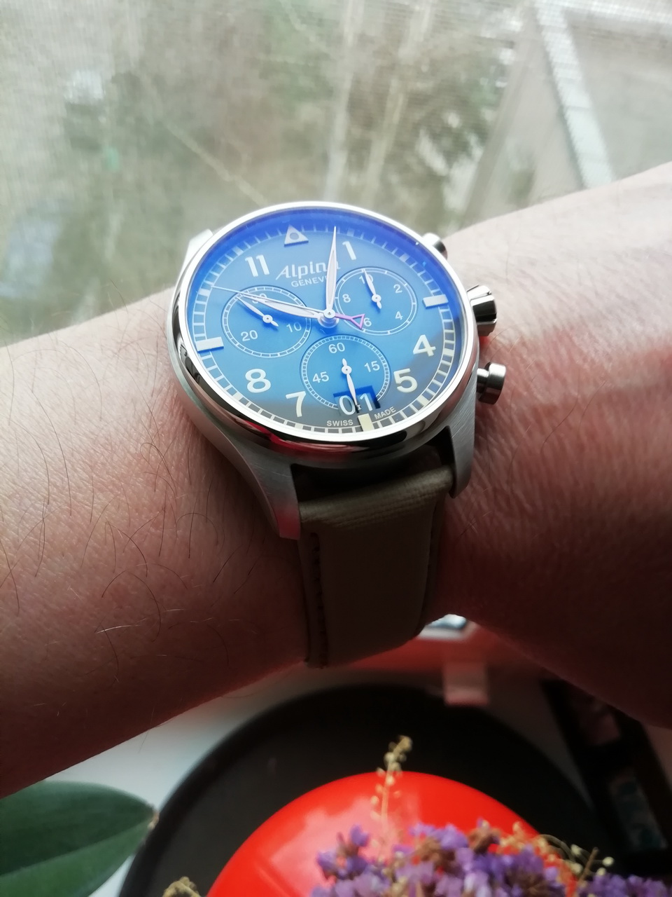 Aviation Startimer Pilot Big Date Camouflage Grey. Часы-хронограф с секундомером до 30мин, точность 1/10с. Секундомер с режимами ADD и SPLIT. В механизме 13 камней. Завинчивающаяся заводная головка. Задняя крышка украшена гравировкой."