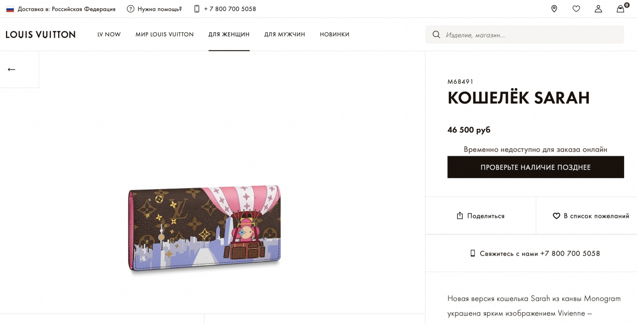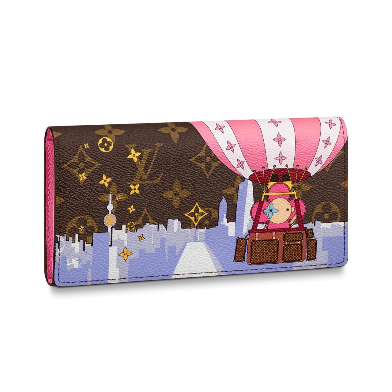 "Элегантный внешний дизайн этого кошелька в форме конверта уже стал классикой Loius Vuitton. Кошелек Sarah сочетает в себе удобный формат и продуманный внутренний дизайн с многочисленными отделениями и карманами. Новая специальная версия кошелька Sarah из канвы Monogram украшена ярким изображением Vivienne - неизменного талисмана Дома Louis Vuitton. Прелестная фигурка летит на воздушном шаре над небоскрёбами. Коллекционный аксессуар, воплощающий собой ключевую для Louis Vuitton тему путешествий, станет идеальным подарком для почитателей Дома. В такой особо украшенной версии кошелек из функционального аксессуара превращается в изысканный предмет гардероба, который можно носить не только внутри сумки, но и в руках, как вечерний кошелек-клатч."