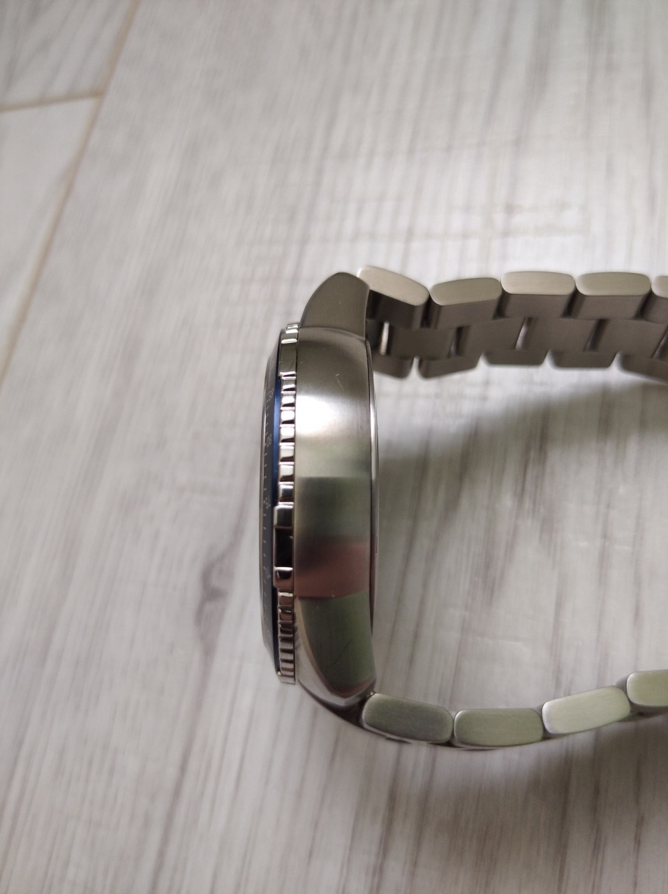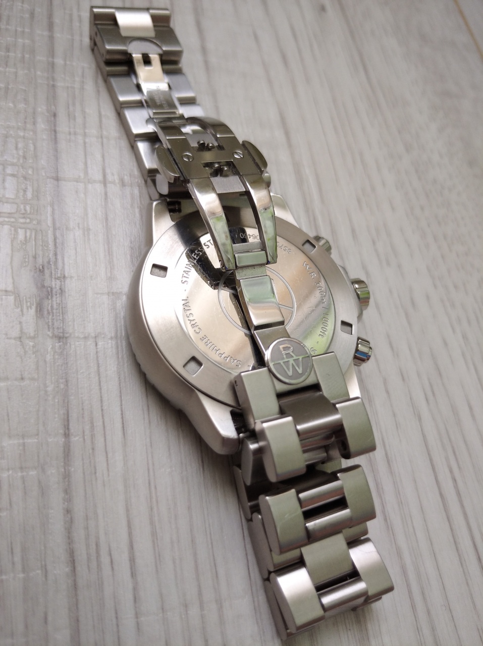 Состояние хорошее, есть естественные следы эксплуатации без экстрима, стекло чистое, хронограф без нареканий. В комплекте две коробки, бирка и три снятых звена браслета.